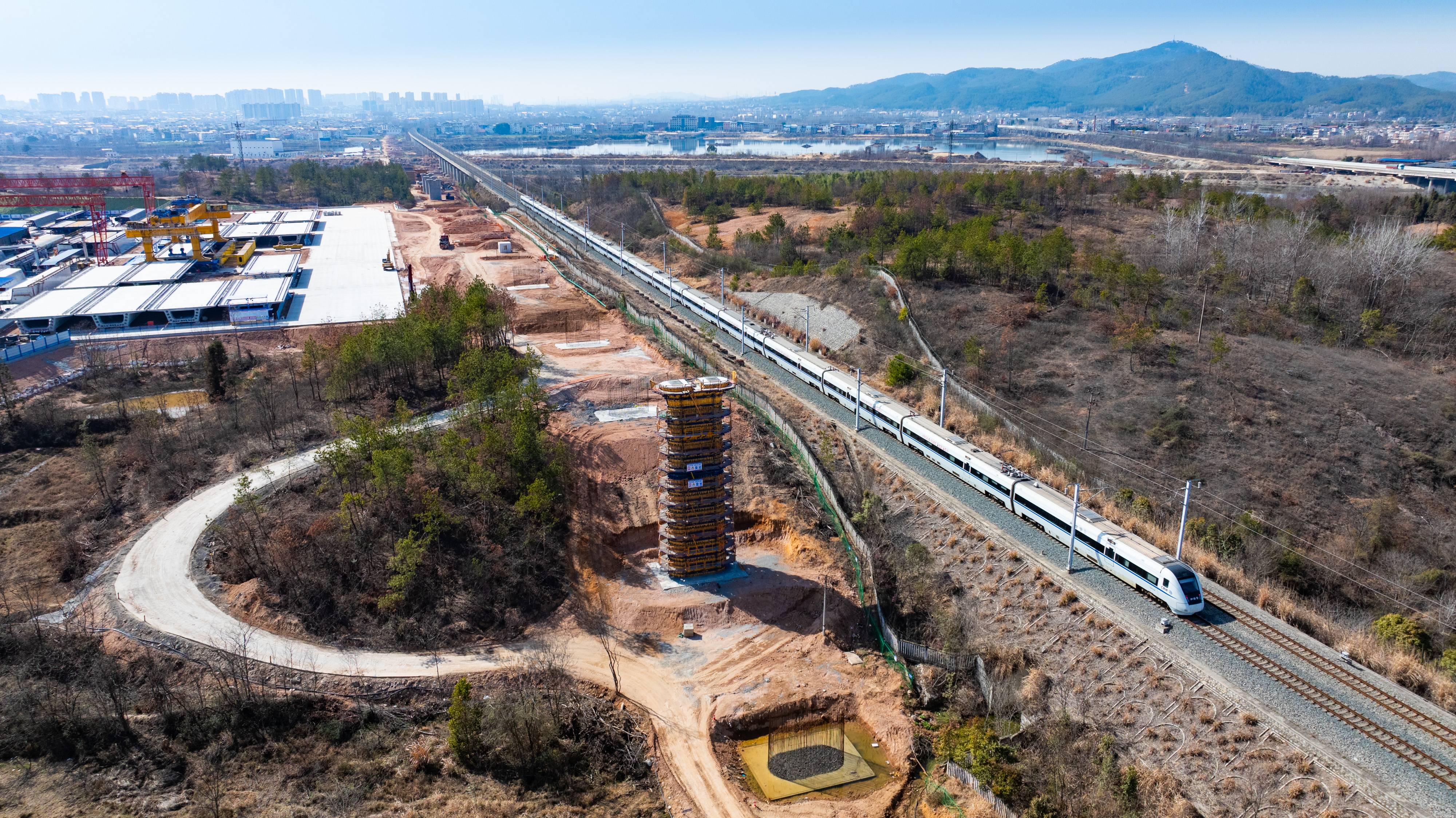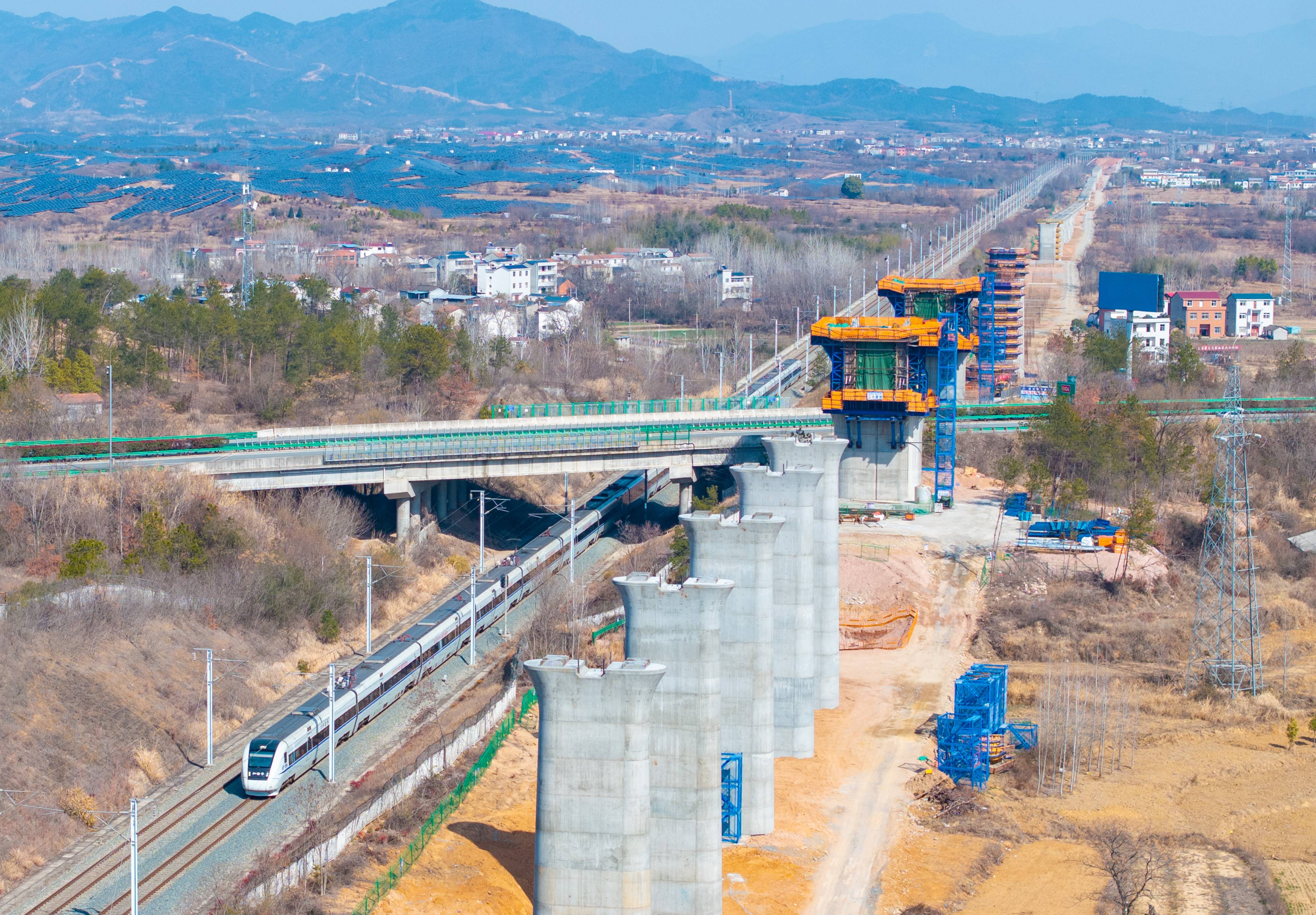2月9日,位于麻城市城区东郊的沿江高铁胡家湾举水特大桥施工现场,20余台吊车、铲车、挖掘机、罐车等来回穿梭,墩基钻孔、渣土转运、混凝土现浇等施工同步推进,近100根桥梁墩身拔地而起、向远方延伸。旁边,便是既有的设计时速250公里的合武铁路,每隔5至10分钟,便有一趟动车组呼啸而过。