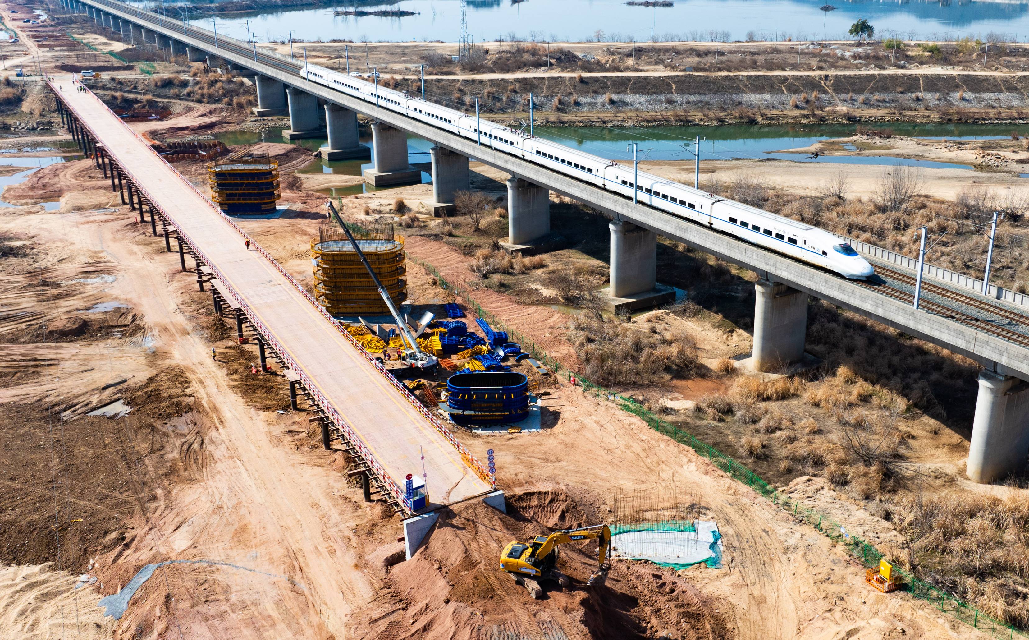 2月9日,高铁列车从沿江高铁合武段麻城举水特大桥建设现场旁驶过。(湖北日报全媒记者 柯皓 通讯员 刘聪 摄)