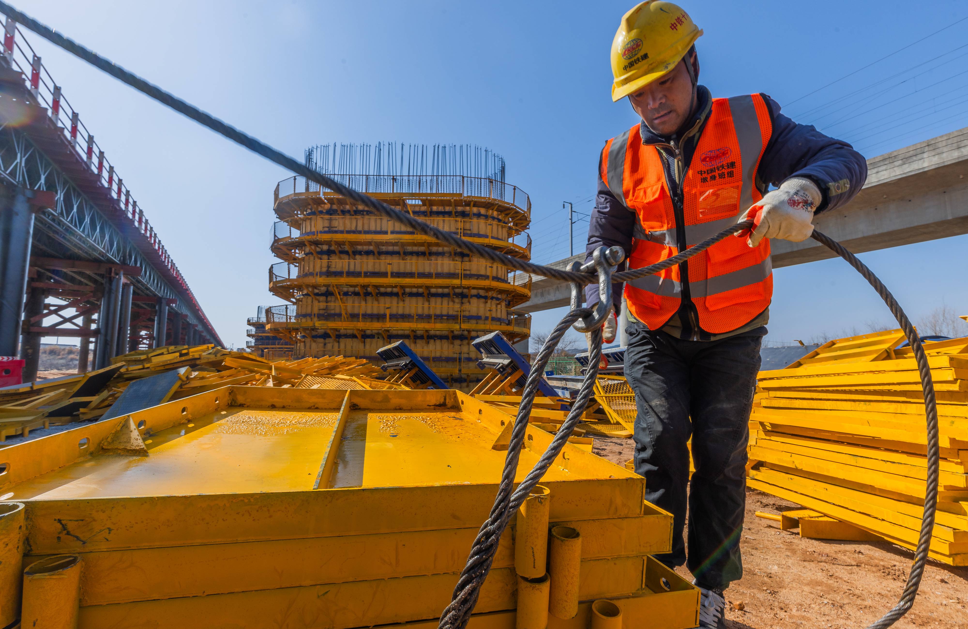 2月9日,沿江高铁合武段麻城举水特大桥建设现场,中铁十八局建设者在进行墩身模版安装作业。(湖北日报全媒记者 柯皓 通讯员 刘聪 摄)