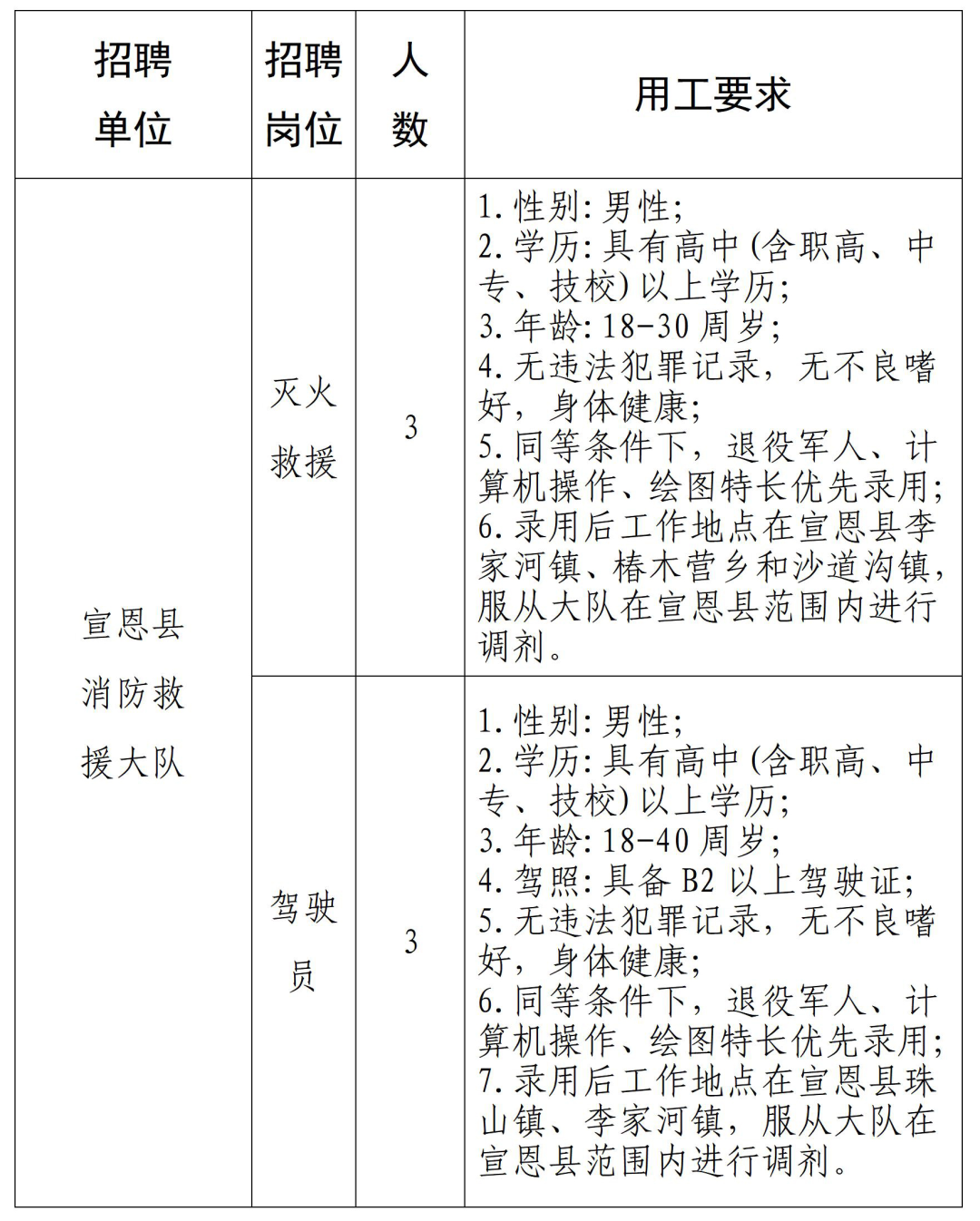 为满足全州社会经济迅速发展对消防力量的需求,恩施州消防救援支队(以下简称“恩施州消防”)委托湖北富元欣兴人力资源集团有限公司(以下简称“富元欣兴集团”),面向社会公开招聘宣恩县消防救援大队政府专职消防队员。欢迎热爱消防、锐意进取、敢于挑战的青年才俊加入政府专职消防队员行列!