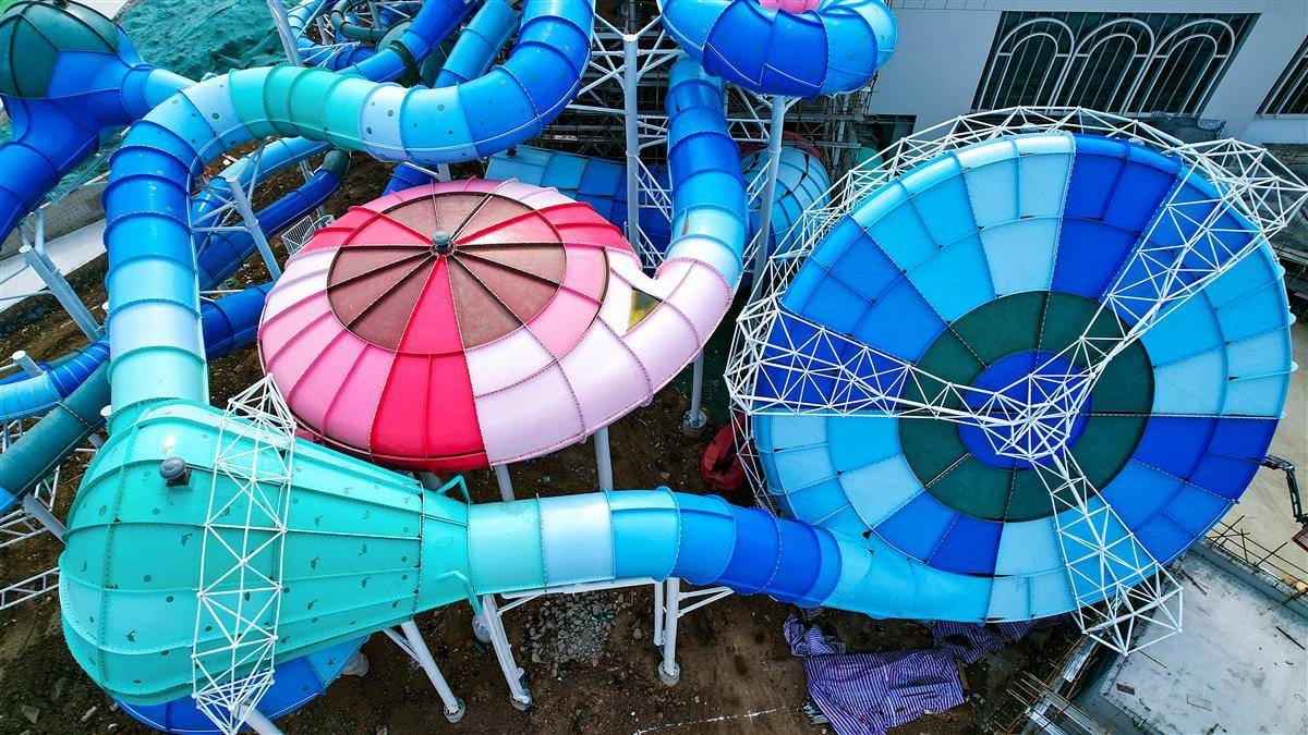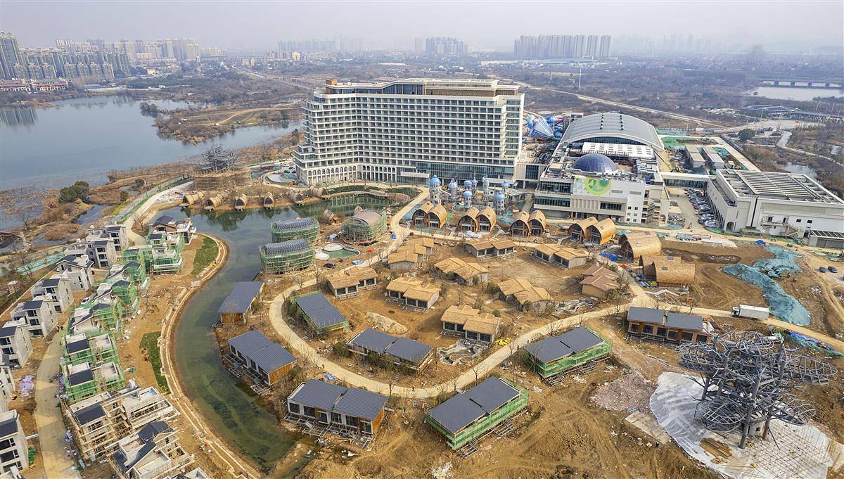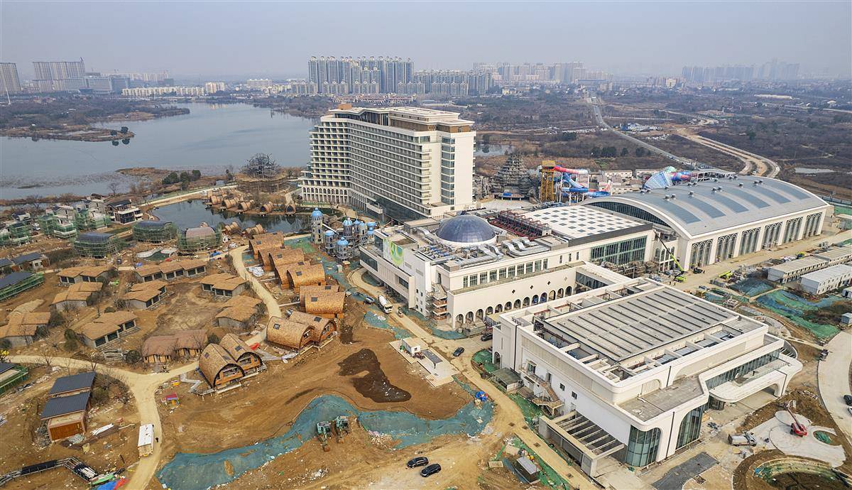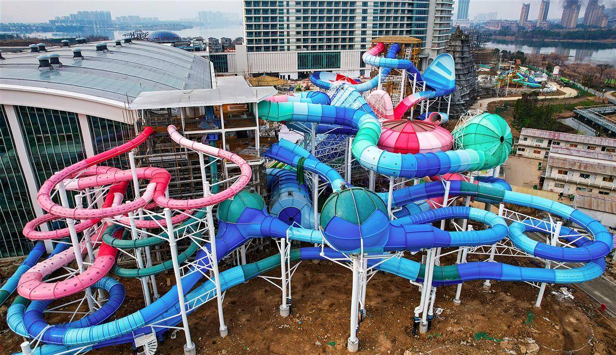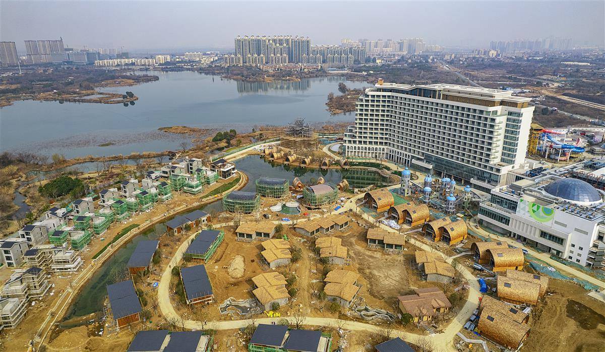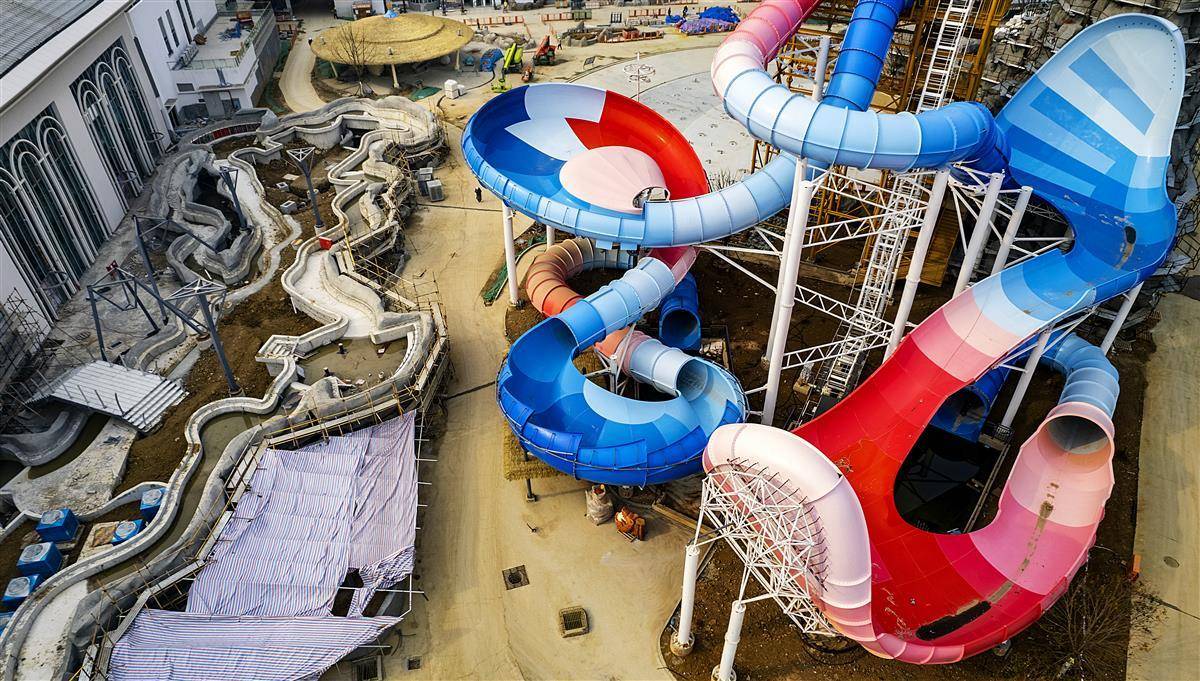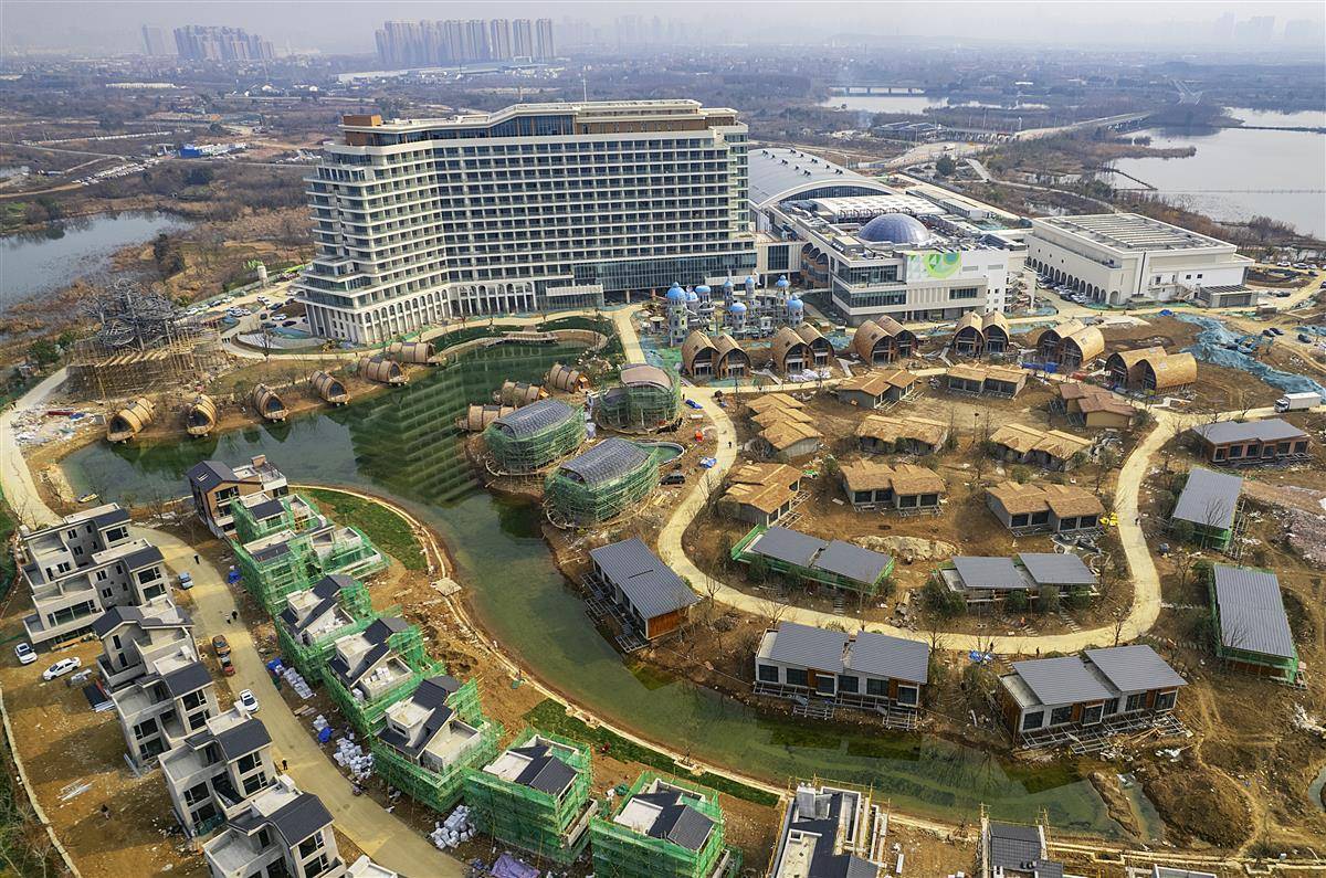 2月13日,鸟瞰武汉城建水世界度假乐园项目,目前项目雏形已经形成,施工人员正在进行设备安装和调试,向今年6月正式运营全力冲刺。水世界建成后将成为华中地区最大的城市近郊一站式亲子度假乐园。