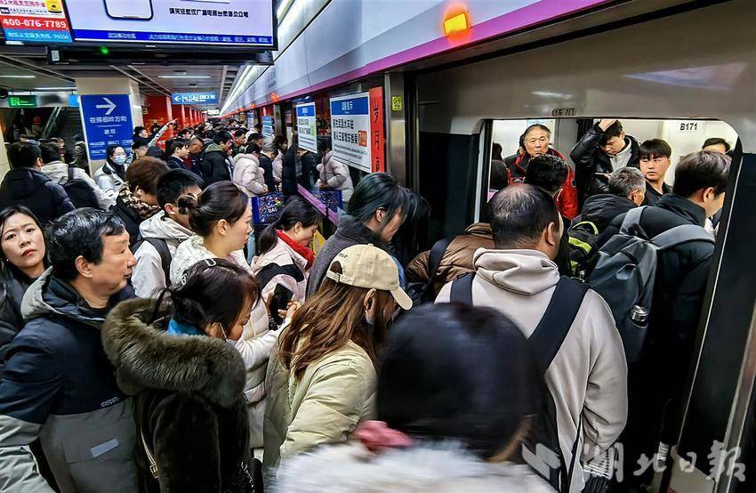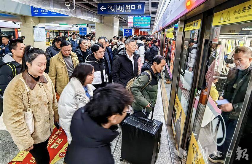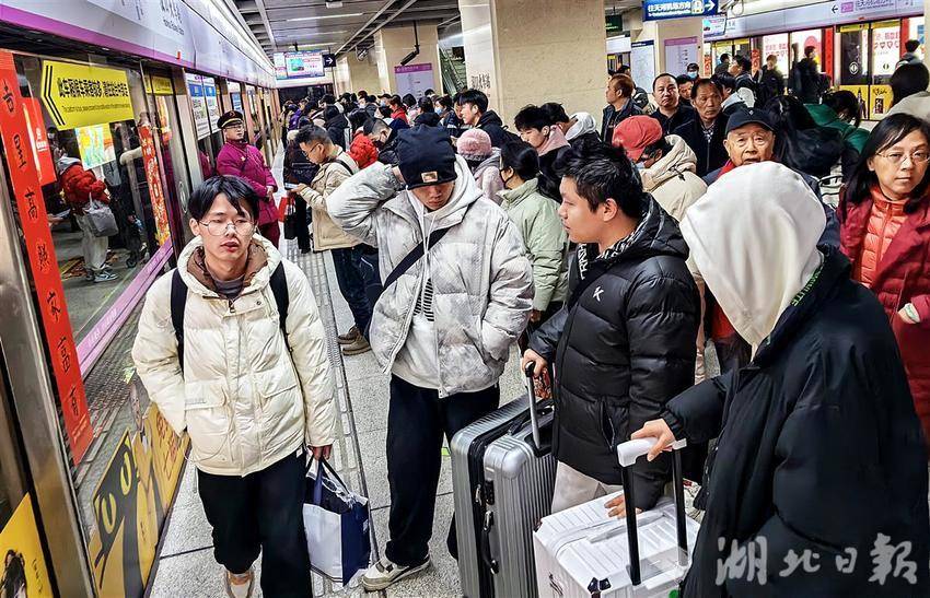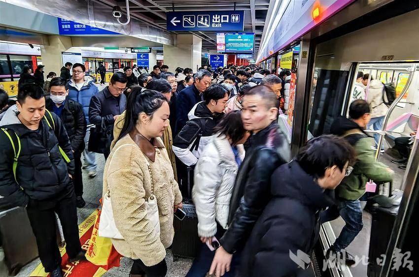2月14日,记者在武汉汉口火车站看到,地铁站人潮涌动。