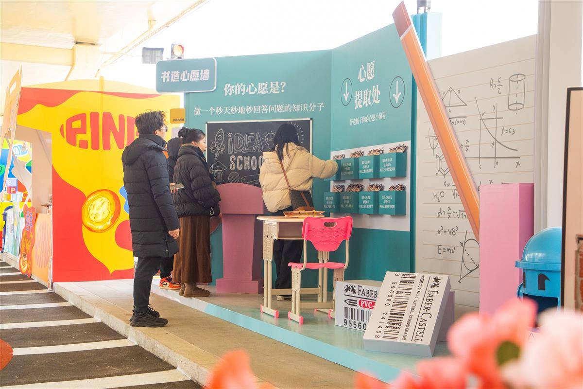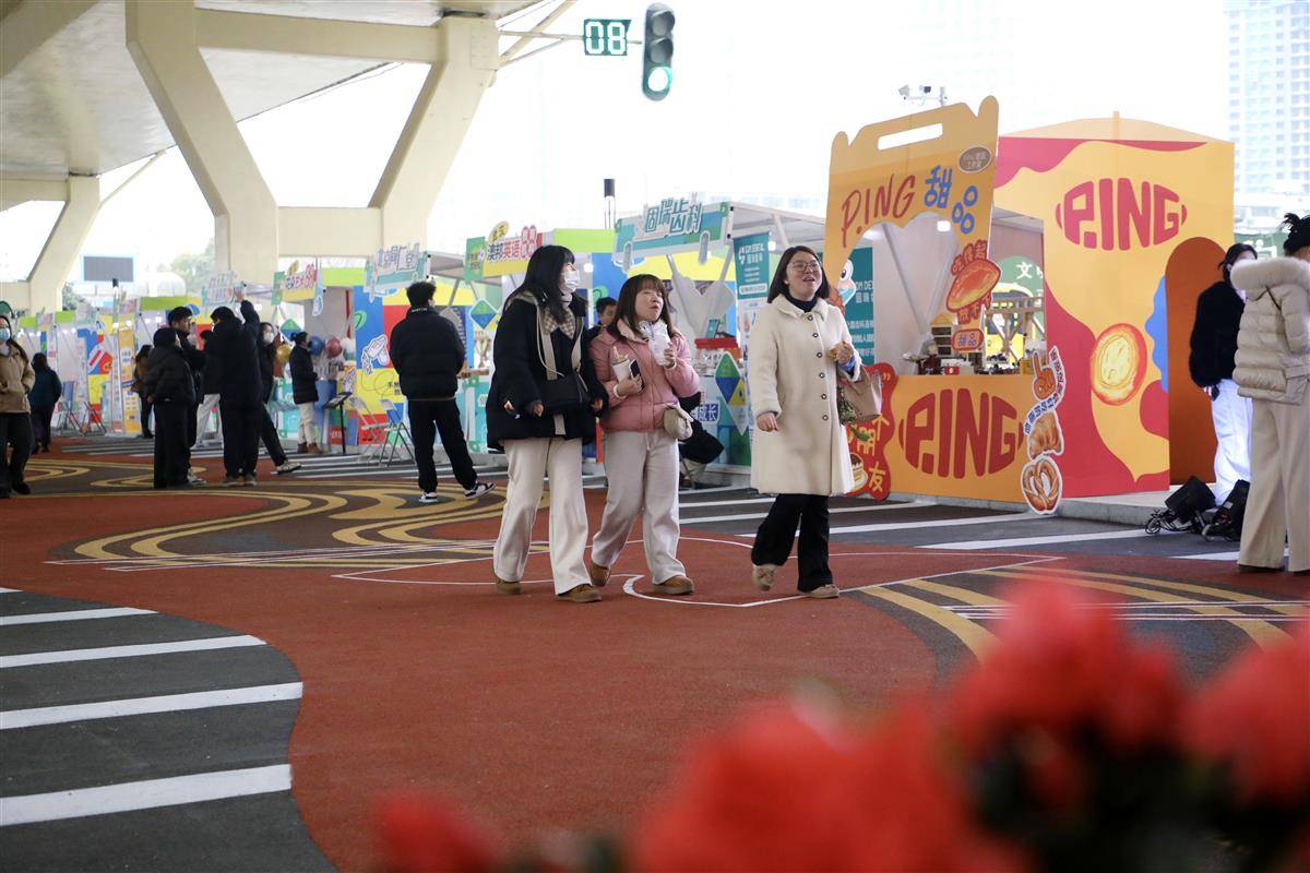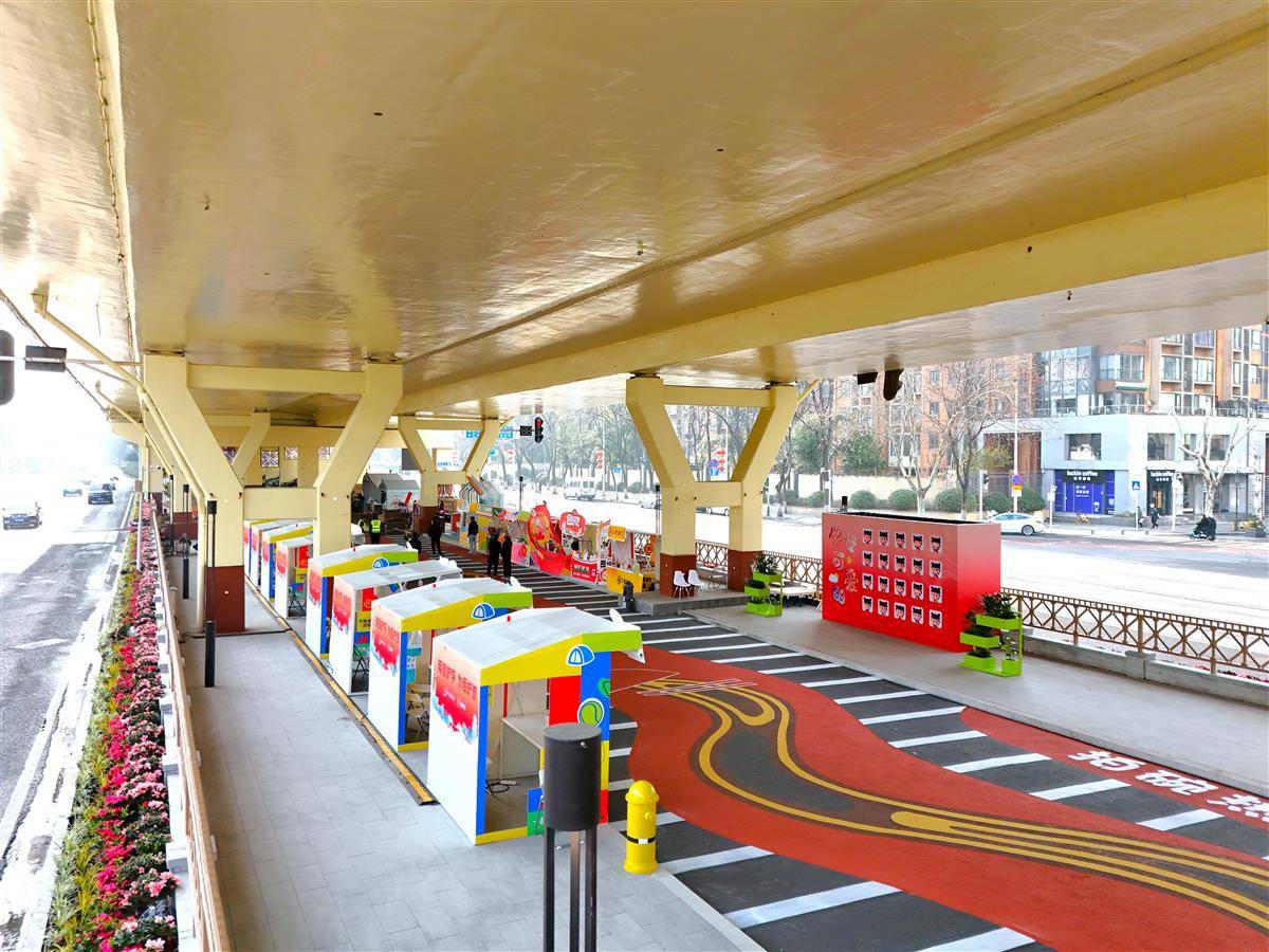 进口左侧是停车区,有142个停车位;中间是护学区,设置座椅、潮玩空间,还有便民护学岗,提供交通疏导和生活应急等服务;右侧是商业打卡区,咖啡、甜品、热干面等餐饮摊位整齐排列。还有武汉地标元素组成的打卡点,市民可在这里拍到轻轨列车穿行而过的风景。