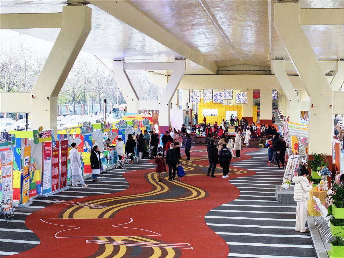 新改造的桥下空间从黄浦大街沿江大道转盘至解放大道转盘,空间以明黄色为主基调,地面铺上了红、黄、绿相间的防滑透水步道,还有波形图案穿插其中,显得热烈活泼。