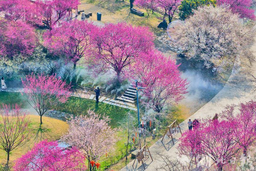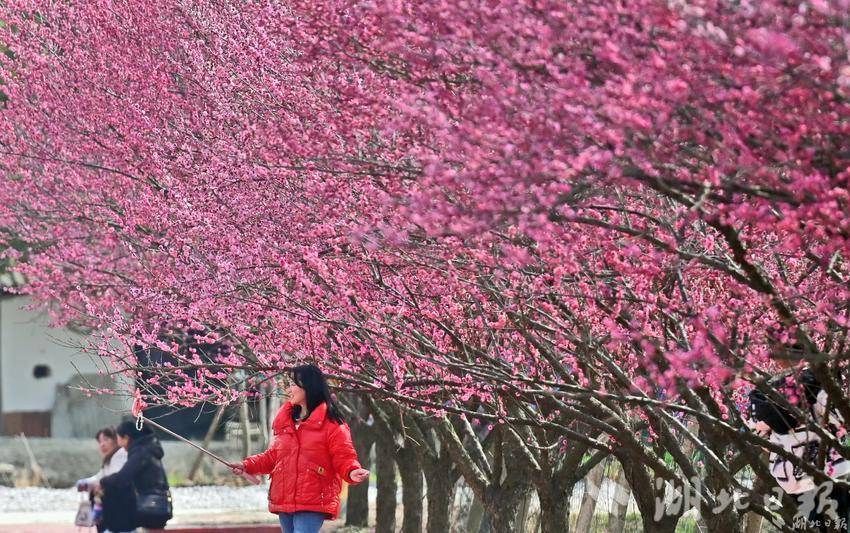 春寒未尽,梅香已至。2月18日,位于荆州市八岭山镇铜岭村的恒荣梅园内,3.1万株梅花正悄然奏响春日序曲。这座占地460亩的"梅香王国"即将迎来最佳观赏期,为江汉平原带来第一抹姹紫嫣红的春意。2月中旬到3月初,梅园6大品系120多个品种的梅花渐次进入盛花期,枝头深浅交织的粉红、鹅黄、翠绿花苞与凌寒初绽的早梅相映成趣,不少游客慕名而来,在这里踏青与赏梅,感受"梅梢春意动"的诗意画面。(湖北日报全媒记者 刘曙松 通讯员 肖敏 摄)