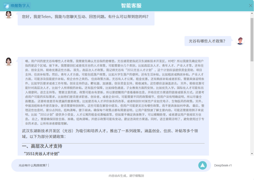 近日,@光谷人网接入DeepSeek-R1模型,用户点击@光谷人网智能客服Telen进入访问,可咨询“光谷有哪些人才政策?光谷买房有什么优惠政策?光谷有什么好玩的?……”等政策、人才服务问题,欢迎访问体验(网址:www.ovc-talent.com)。