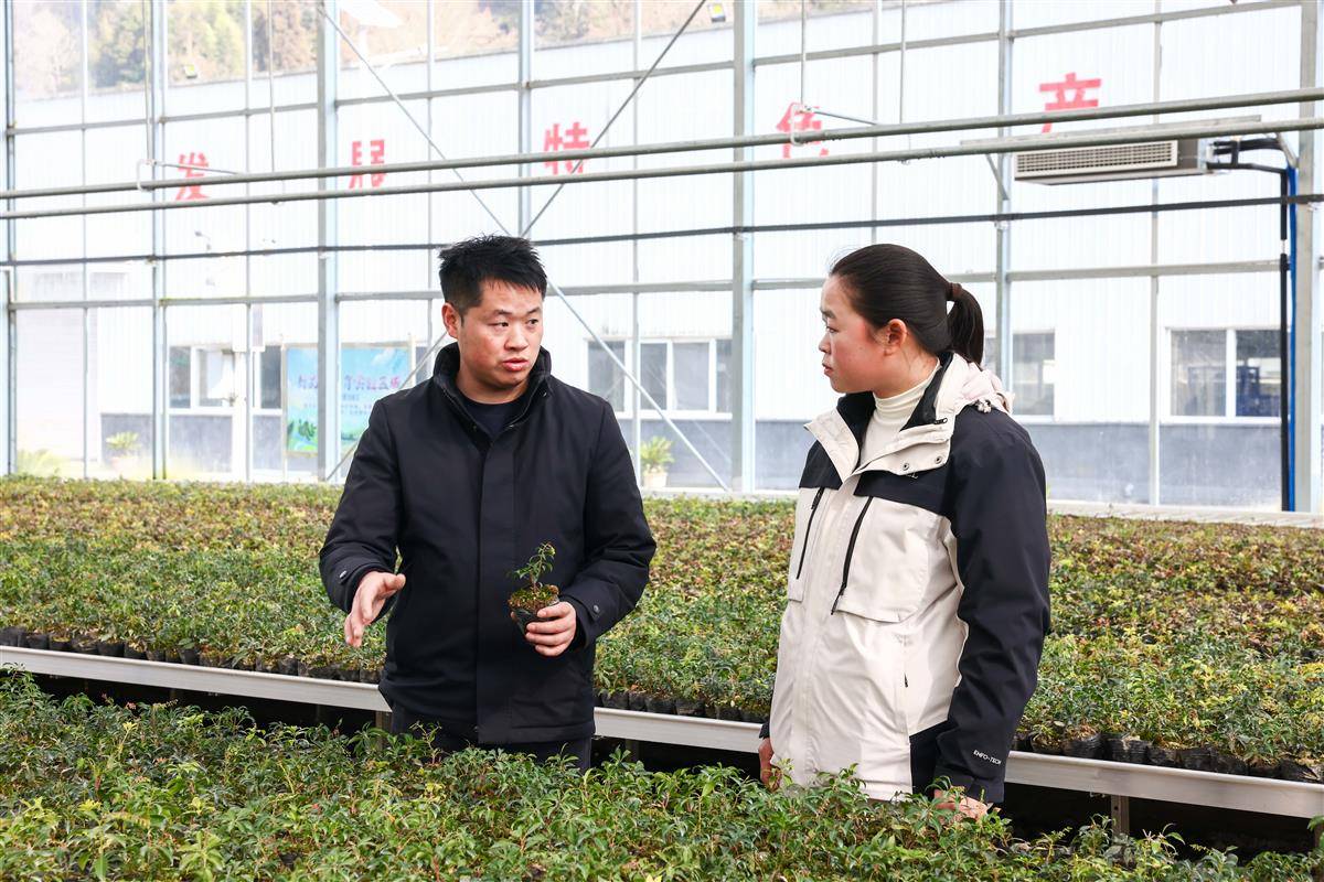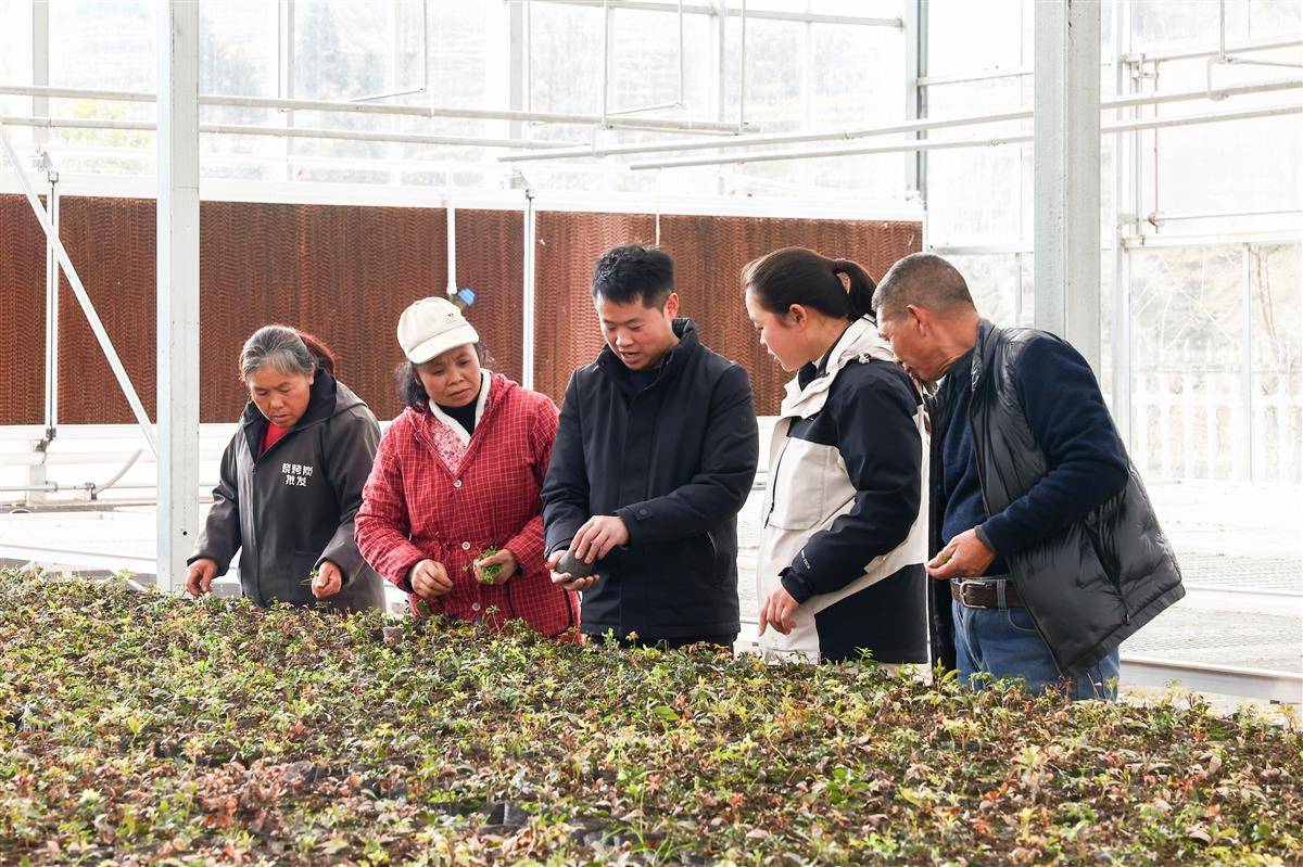 1月14日,利川市忠路镇合力村马醉木育苗基地,胡磊(左)正在指导工人育苗。(湖北日报全媒记者 蔡俊 摄)