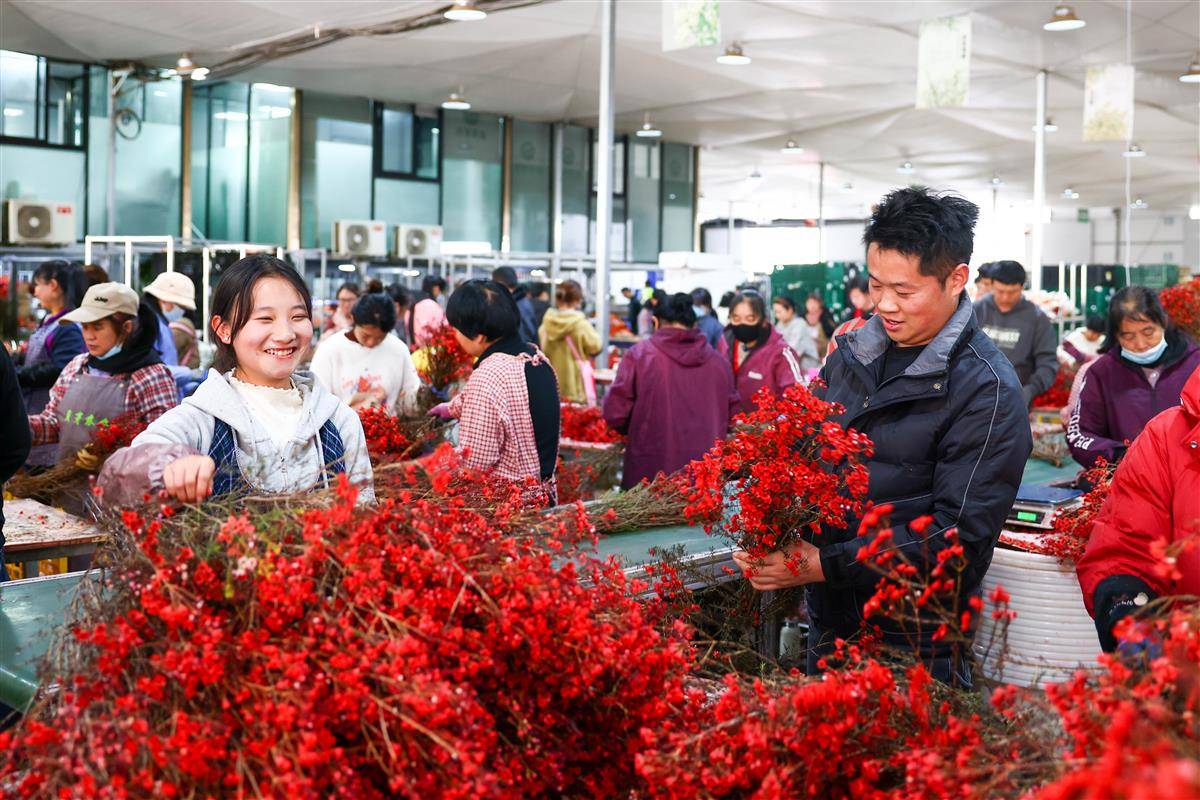 在忠路镇的种植基地,数百名农民忙着采枝、打包、装车;在昆明的加工基地,200余名工人忙着修枝、催花、包装,赶制订单……两头都是忙碌景象。