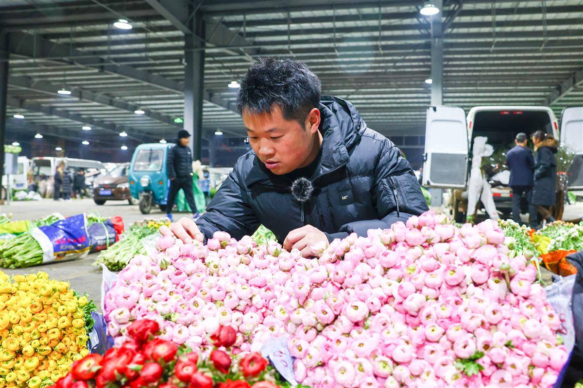 1月21日凌晨,在云南昆明斗南花市,胡磊正在挑选鲜花。(湖北日报全媒记者 蔡俊 摄)