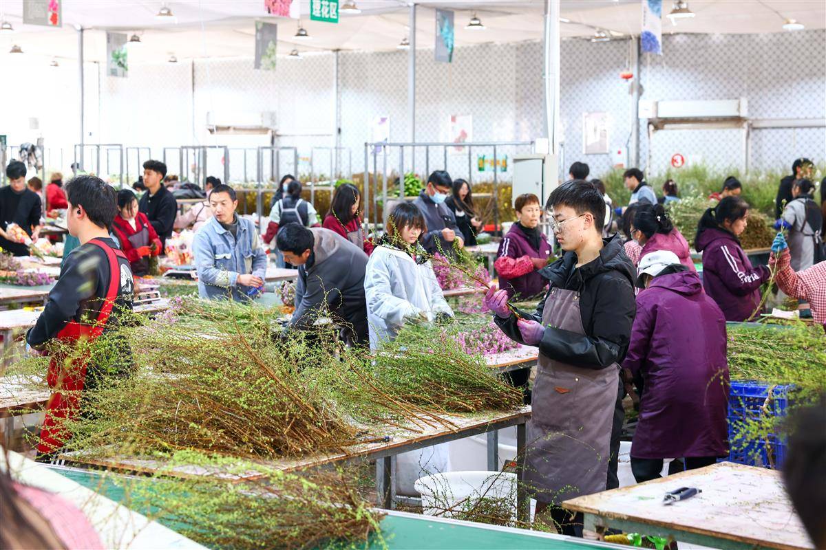 图为忙碌的昆明国际花卉拍卖交易中心货场。(湖北日报全媒记者 蔡俊 摄)