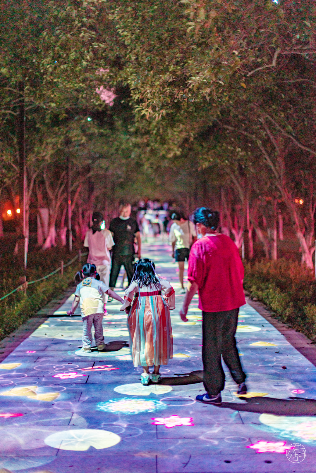 屈原纪念馆前的百米步梯,每晚七点半准时化身赛博梦境。伴随着悠扬的琴声,地面秒变「湖面」,硕大的荷叶和锦鲤四处流转,每走一步,脚下就会生出一朵莲花或烟花。