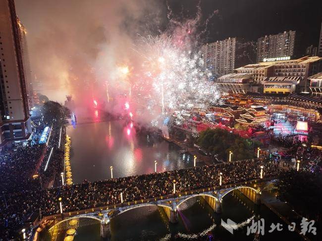 2月12日元宵夜,贡水河畔人潮涌动。8点28分,随着一声声轰鸣,万千烟花在宣恩县城墨达楼前贡水河上的夜空中绽放,金色流苏、七彩祥云、字幕烟花与城市夜景交相辉映,将整座小城映照得宛如童话世界。市民与游客的欢呼声、相机快门声此起彼伏,不少游客高举手机开启直播,与远方的亲人“云团圆”,共享美好时刻。
