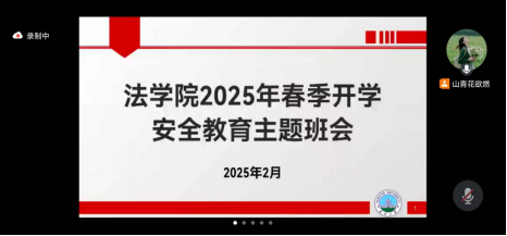 为切实保障学生安全、有序返校,全方位守护学生在校期间的安全与健康,法学院开展了2025年春季学期开学安全教育主题班会,研究生与本科生全体参与,充分彰显出学院对学生返校安全工作的高度重视,为新学期学生们的学习与生活筑牢根基。