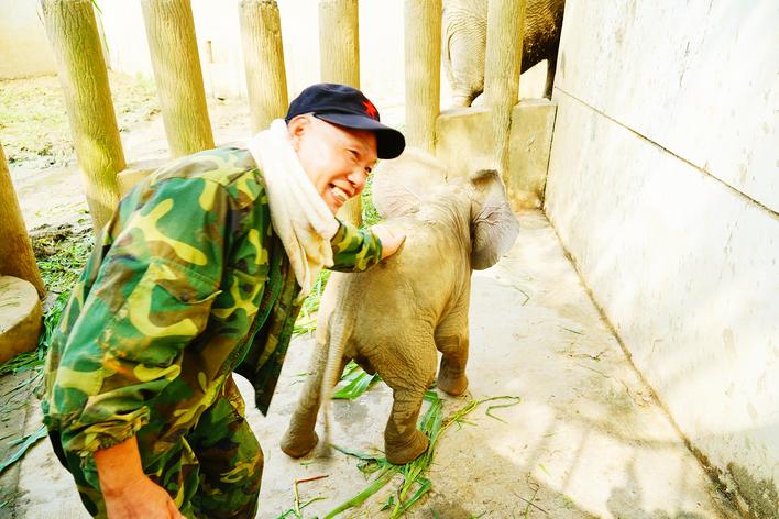 同样的抢险画面,也出现在非洲象“申申”出生之时。当时,非洲象妈妈“阿南”用腿给它的宝宝除胎衣时,一不小心将它踢到了水坑里。保育员李万利果断上前先安抚焦急的“阿南”,待其情绪缓和下来后,他和同事们合力将小象从水坑里抬了出来,而这一切都在“阿南”的注视之下完成。“‘阿南’对我的充分信任,我才有十足把握抢险成功。”这深深的信任,源于从1997年阿海阿南这对非洲象来园后,李万利就一直是它们朝夕相伴的“保姆”。