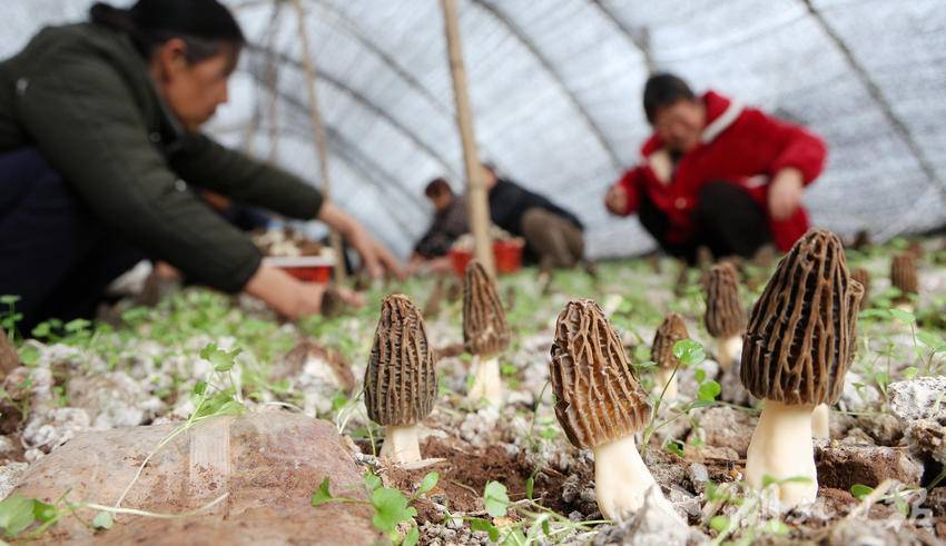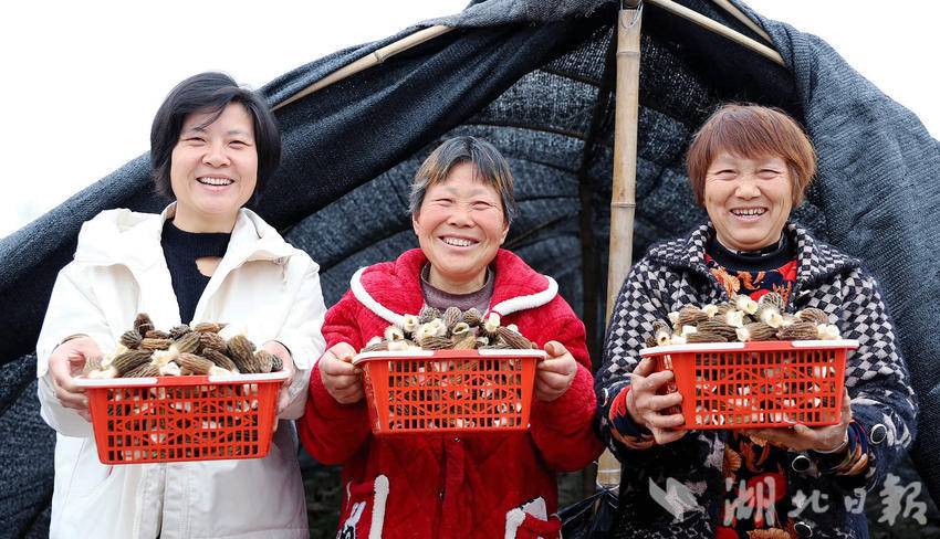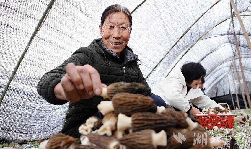 湖北日报客户端讯(通讯员伍玉华、虞顺意、周进伟、孟艳)春回大地,万物复苏。走进远安县旧县镇徐家庄村羊肚菌种植基地,大大小小的羊肚菌撑着褐色的“小伞”破土而出,长势十分喜人。工人们穿梭于菌垄间,小心翼翼地采摘头茬羊肚菌,一派繁忙的丰收景象。