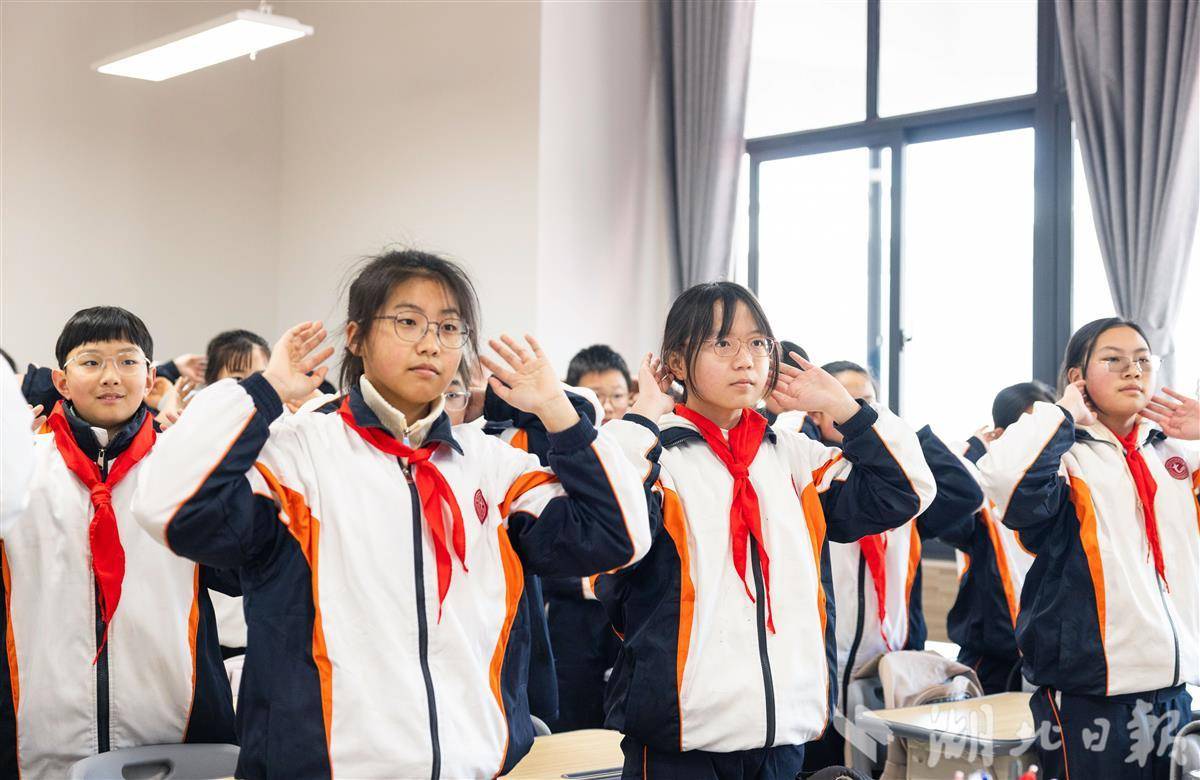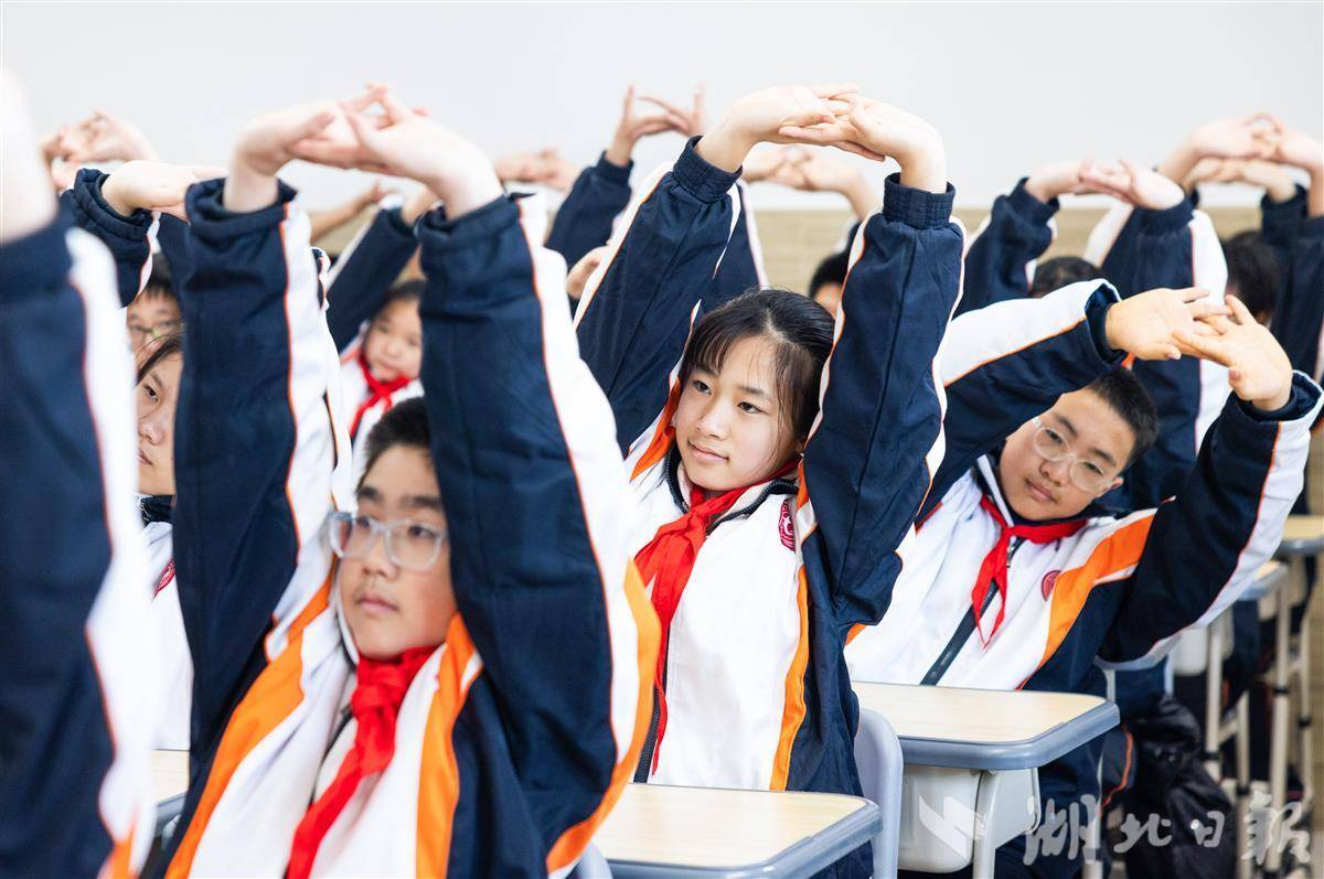 2月24日,武汉市七一华源中学,中学生们在大课间练习课桌操。