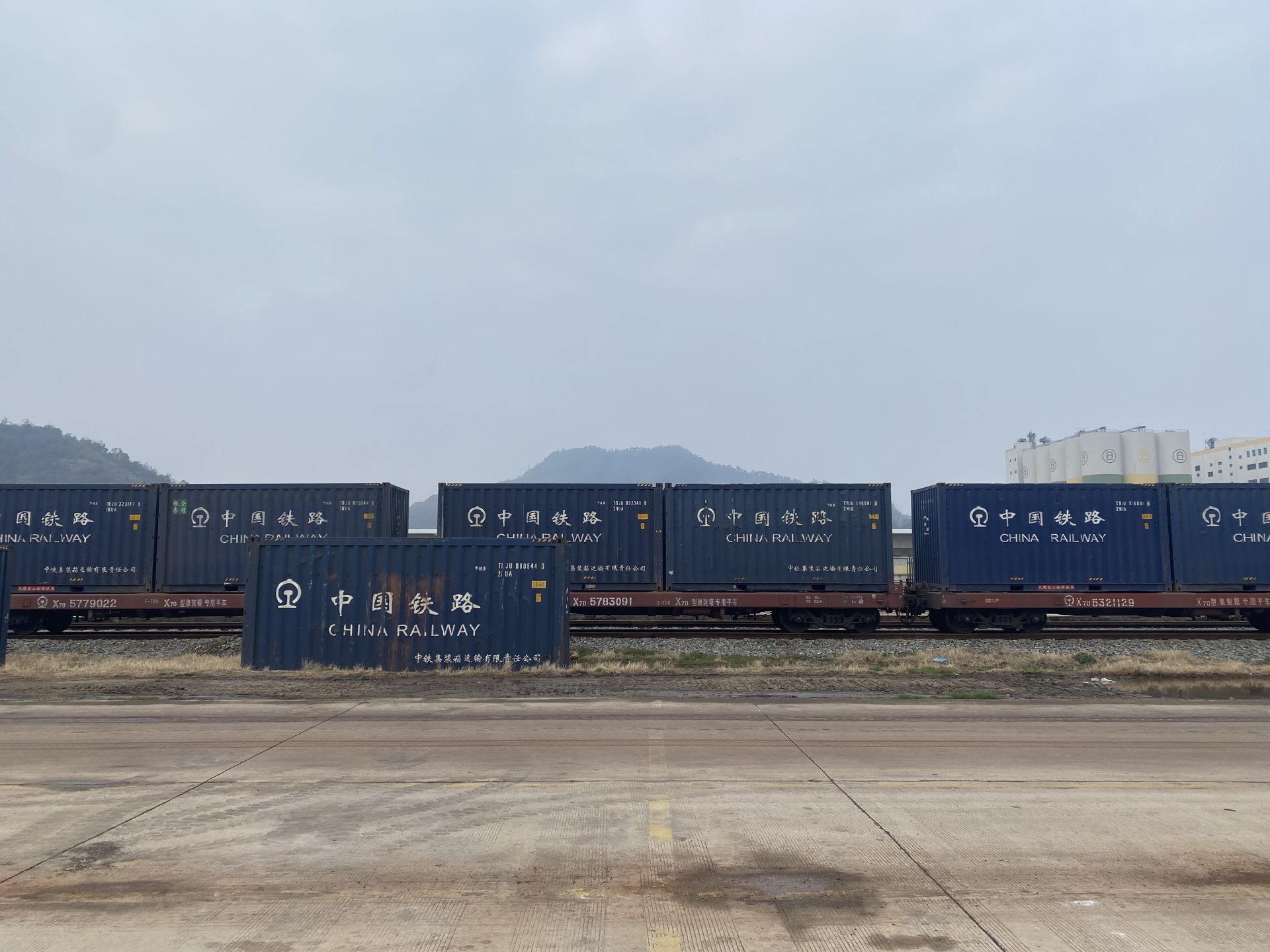 在位于金湖街道的海虹物流园,载着铁矿石的火车驶入物流园后,便通过集装箱卡车短途运输至大冶华鑫实业有限公司。
