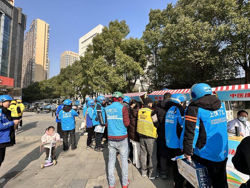 宣讲结束后,文明集市开张营业。东风路街道在现场设置了法律咨询、政策宣传、电动车维修保养、中医康复理疗、爱心理发、文明交通和红色驿站宣传等7个服务摊位,为小哥们解答关心的问题,提供“一站式”服务,发放政策宣传单、安全头盔和护膝等暖心礼包200余份。