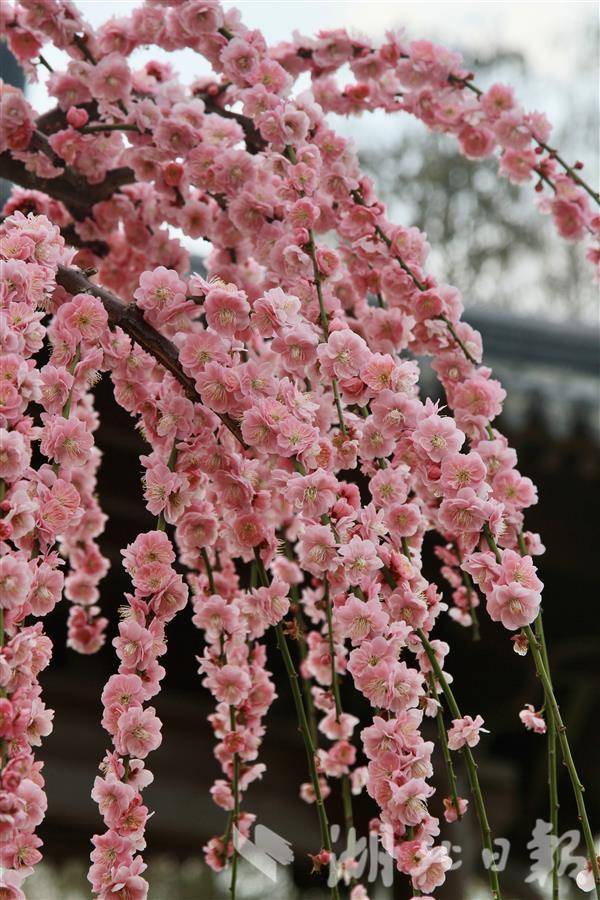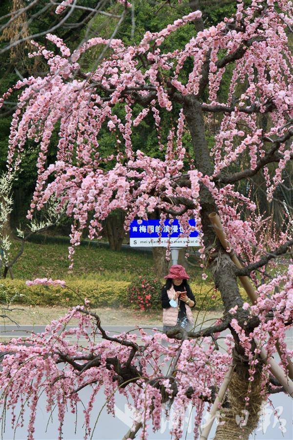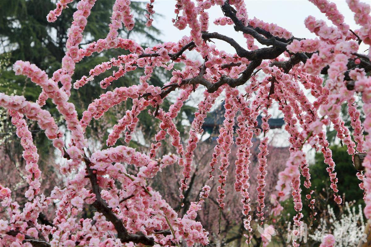 繁花似锦,绯云倾泻,粉瀑垂落。作为梅中的后起之秀,垂枝梅美得别具一格。五福垂枝——垂枝梅的一种,开粉红色花、重瓣,花开繁密,据东湖梅园工作人员介绍,系新引进的品种,树高近5米,层层叠叠至少5层,这种大型垂枝梅国内少见。更为难得的是,此品种的垂枝梅长满整株,即从小苗开始培育,而其他品种基本是在直枝梅上嫁接垂枝,视觉效果远不如五福垂枝。