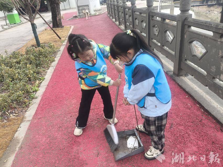 活动中,大班孩子们在老师带领下,来到河道边。孩子们拿起小扫帚、垃圾桶等清洁工具,认真清理着走道上的落叶与杂物,不怕脏、不怕累,用实际行动践行雷锋精神。