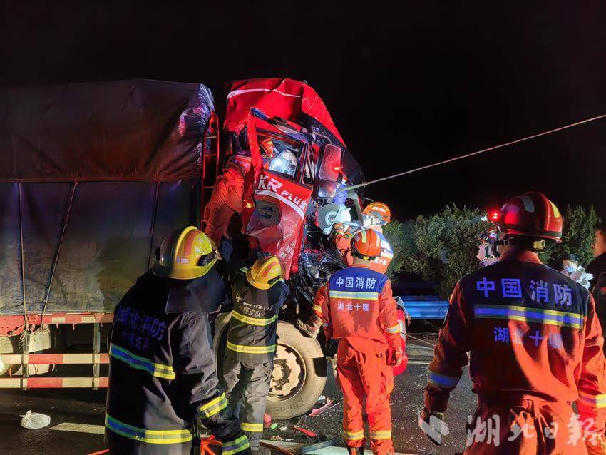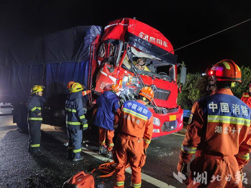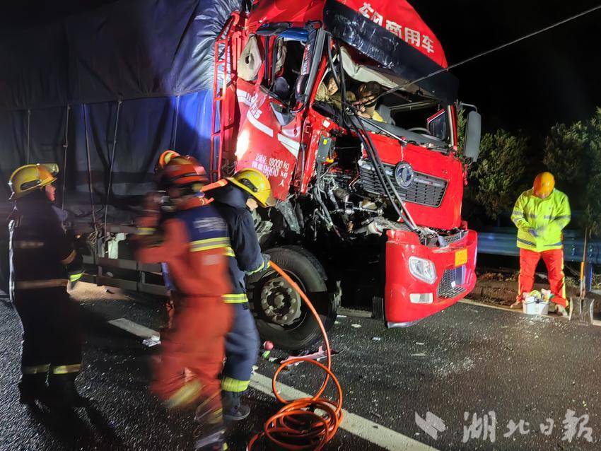 湖北日报客户端讯(通讯员 杨晓峰 柳安娜)3月4日凌晨,福银高速丁家营段发生惊险一幕,一辆货车因交通事故车头严重变形,车内两人被困,副驾驶人员被困车内,形势较为严重。丁家营镇消防救援站闻令而动,迅速联合武当山消防救援大队展开营救,最终成功完成救援任务。