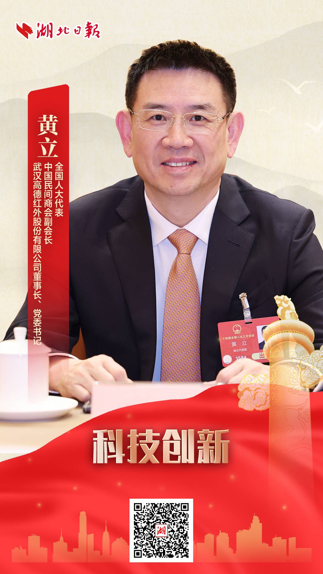 全国人大代表,中国民间商会副会长,武汉高德红外股份有限公司董事长、党委书记黄立:去年11月,习近平总书记在湖北考察时,对湖北提出了“在推进科技创新和产业创新上开拓进取”,“努力打造具有全国影响力的科技创新高地”的重要要求,为湖北的发展指明了方向。