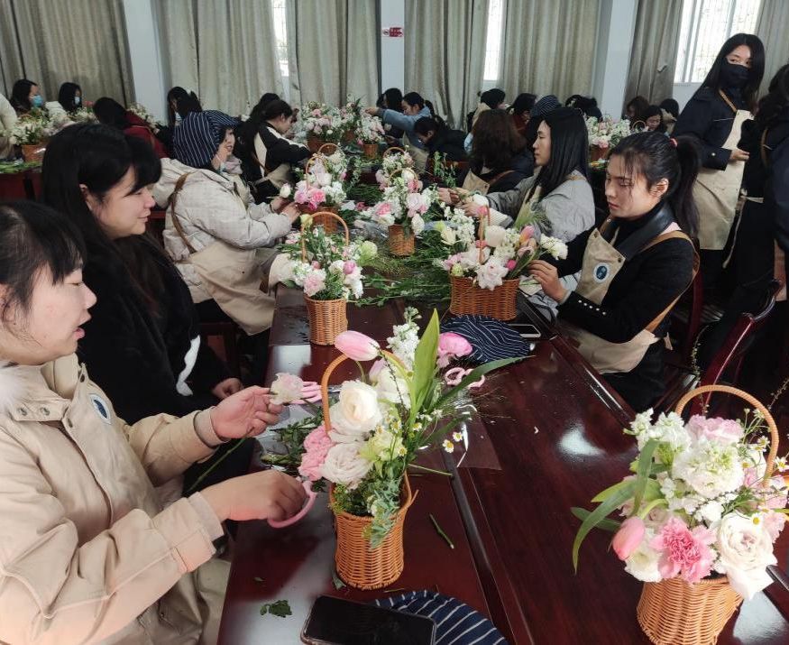 女职工们正在亲手制作花篮