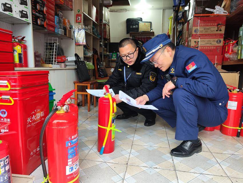 在消防器材经销店,执法人员对店内正在销售的灭火器、应急灯、消防水带、水枪等产品开展了“三查三核”,即查产品认证证书、出厂合格证明等文件;核产品外观参数与认证信息一致性;通过扫描二维码、登录消防产品信息网核查产品身份信息,同步要求商家严把进货关,严禁销售“三无”及淘汰消防产品。
