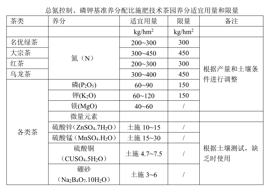 我国茶类多、品质要求复杂,茶叶采摘标准多样,茶园立地条件多变,难以直接依据产量水平、土壤条件确定养分用量。我们提出了氮素总量控制、磷钾基准养分配比、中微量元素因缺补缺的技术路线,确定茶园养分用量。