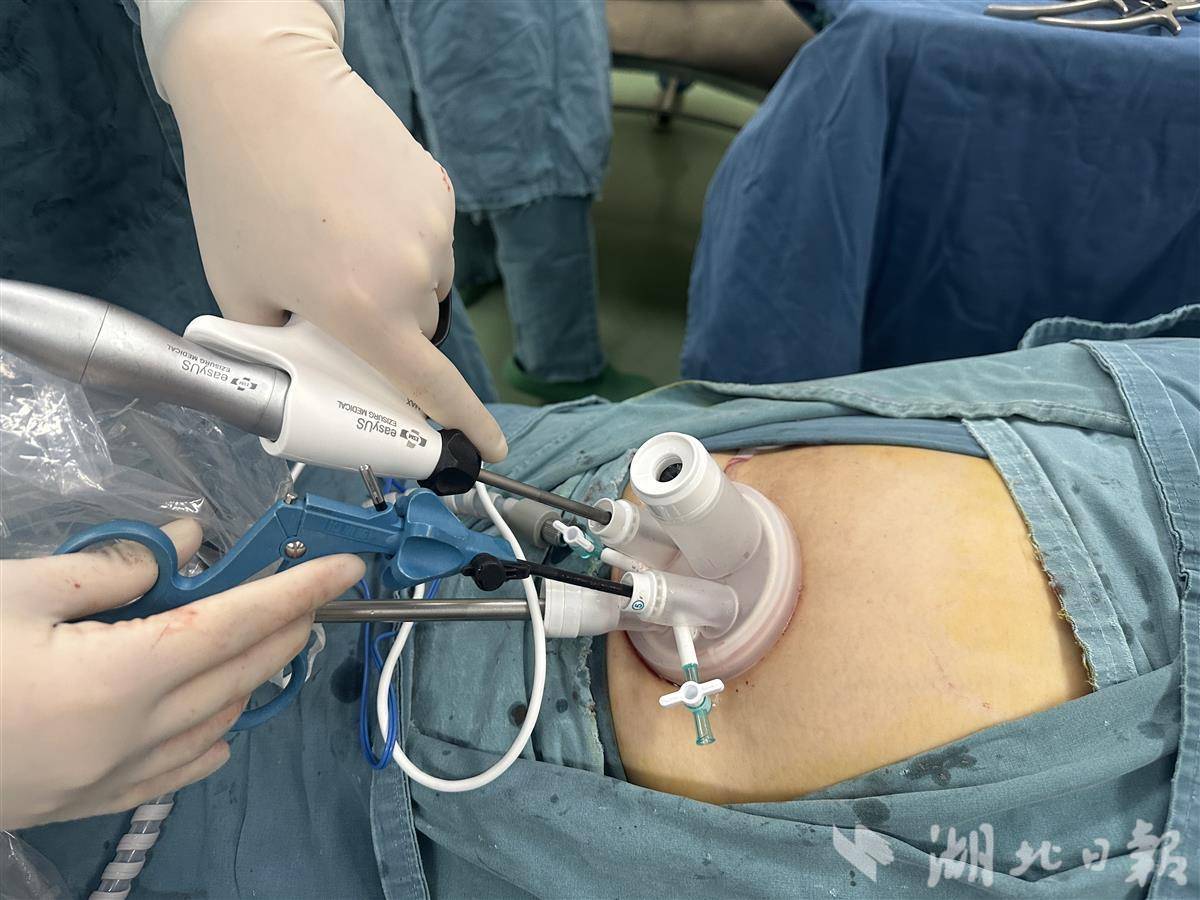 患者王女士今年50岁,家住枣阳,在一次常规体检时发现肝脏占位病变,前往湖北省肿瘤医院就诊,被确诊为肝脏大血管瘤。考虑到传统开腹手术切口大、疼痛明显、恢复周期长,熊锐团队决定采用经脐单孔腹腔镜手术。“对病人来说,该术式创伤小、疼痛轻、恢复快,更加契合现代加速康复外科(ERAS)理念。”熊锐说。