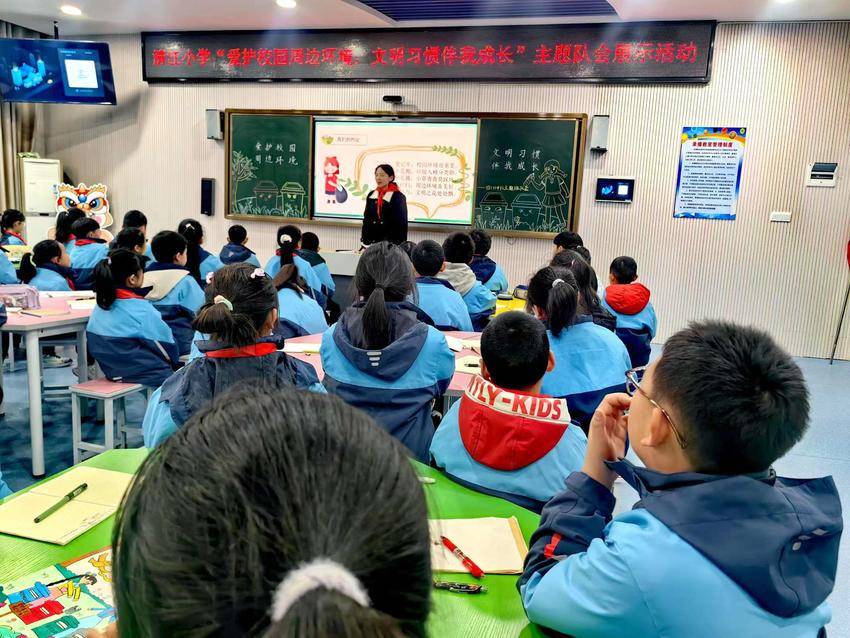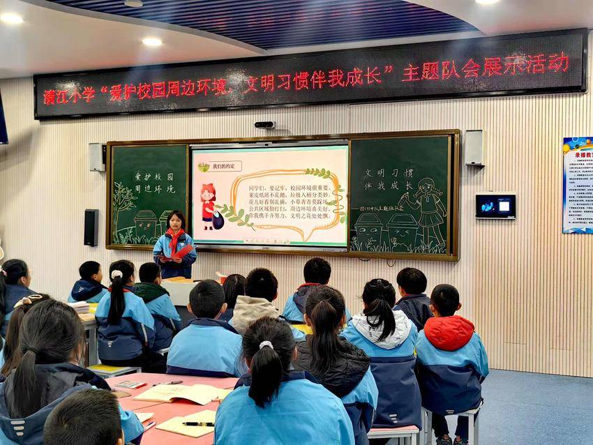 湖北日报客户端讯(通讯员刘玲、陈艳娇)3月14日,宜都市清江小学403中队开展了一场别开生面的“爱护校园周边环境,文明习惯伴我成长”主题队会。活动通过校企社三方联动,创新采用“沉浸式教育”模式,特邀宜都市教育局工会主席刘武、宜昌洁华劳务保洁有限公司总经理邓春华及十余名环卫工人共同参与,为学生们上了一堂生动的生态文明实践课。