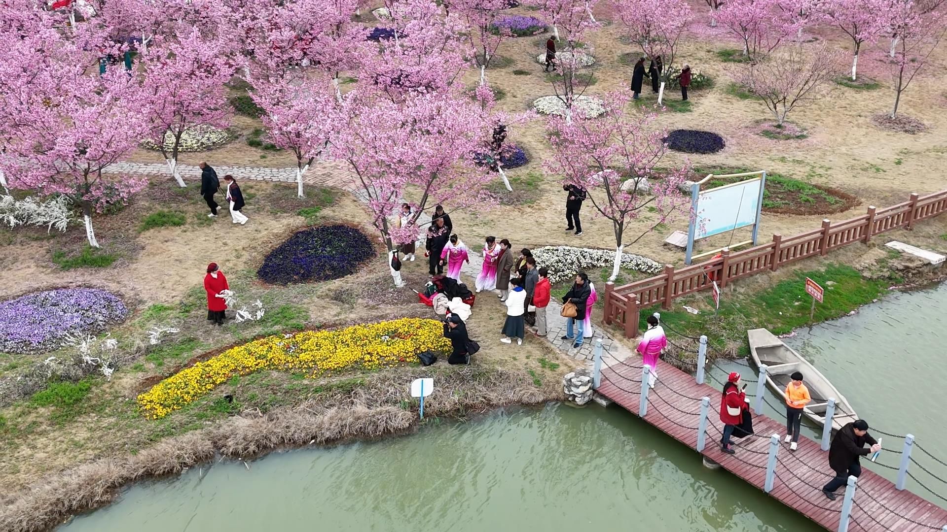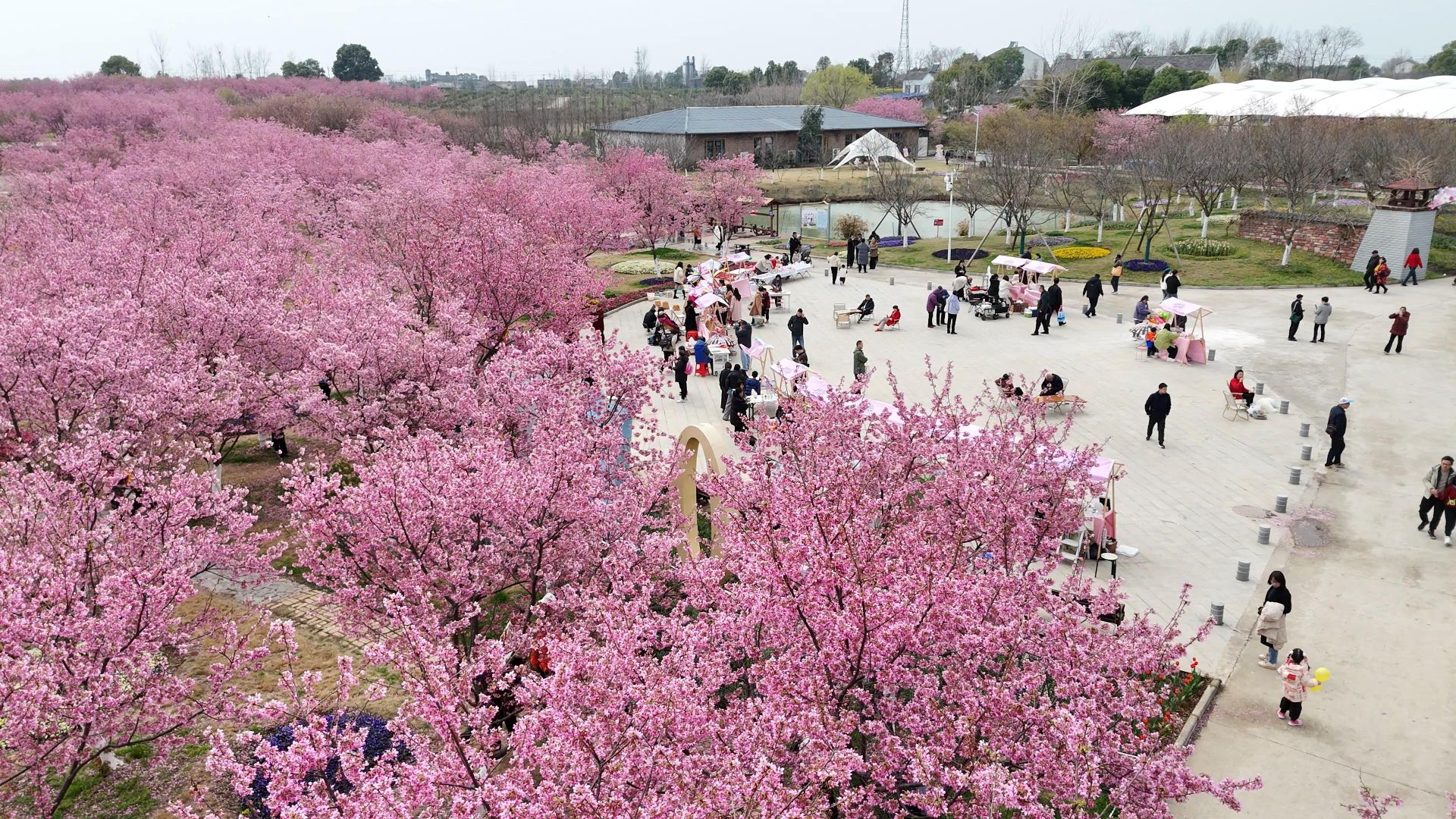 在问安镇同心花海景区,香水樱、中国红樱、小牡丹樱等12个品种的千亩樱花竞相绽放,十里樱花长廊蜿蜒起伏,微风拂过,落樱缤纷如雪。景区内巧妙融合自然景观与人文创意,在樱花步道两侧设置鲜花交易市集,樱花广场嵌入手工市集,精美的陶艺与手作引得游客驻足观赏。