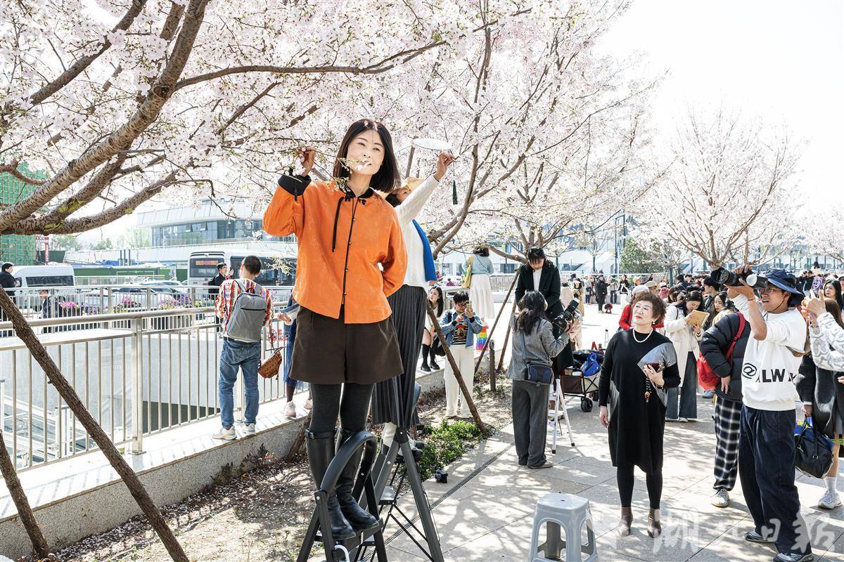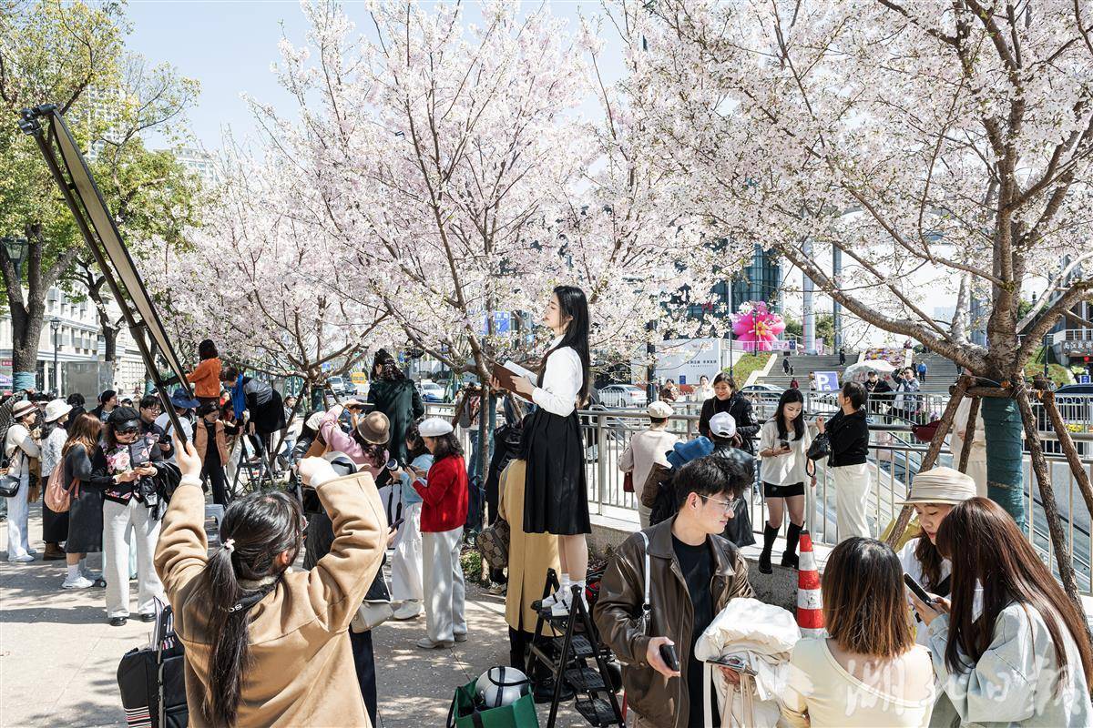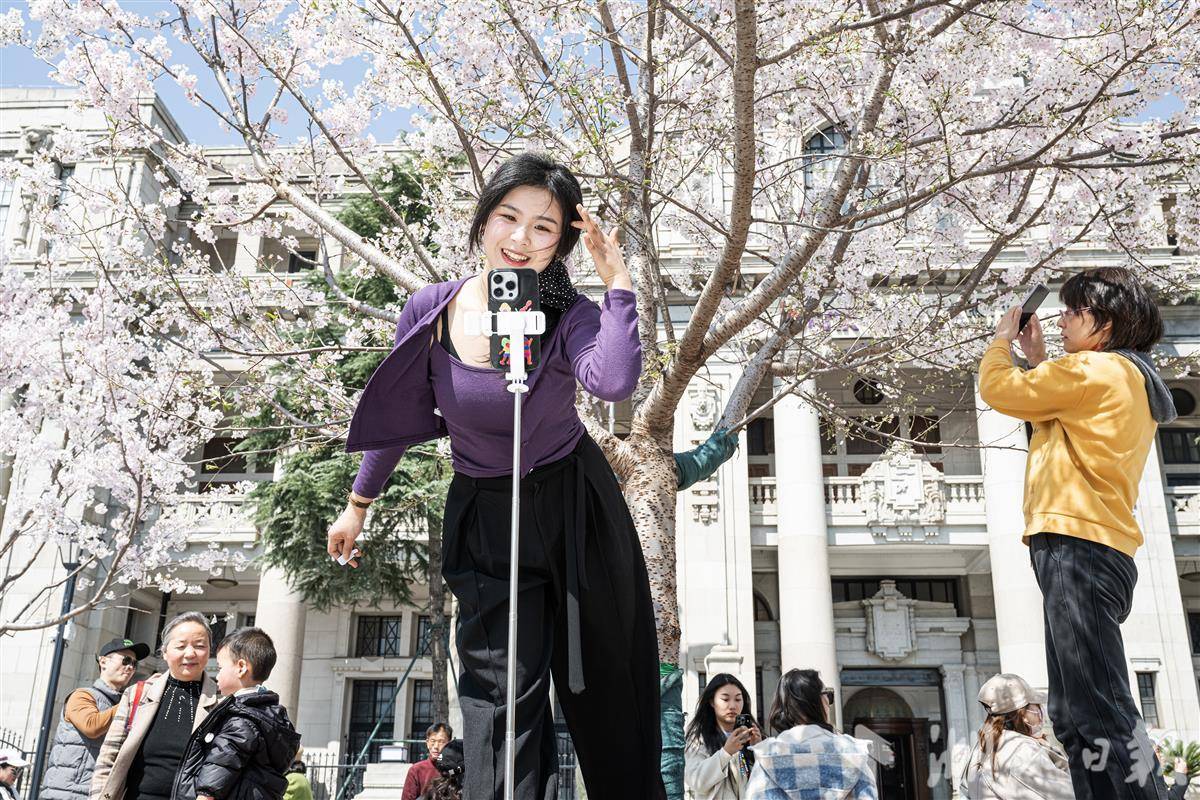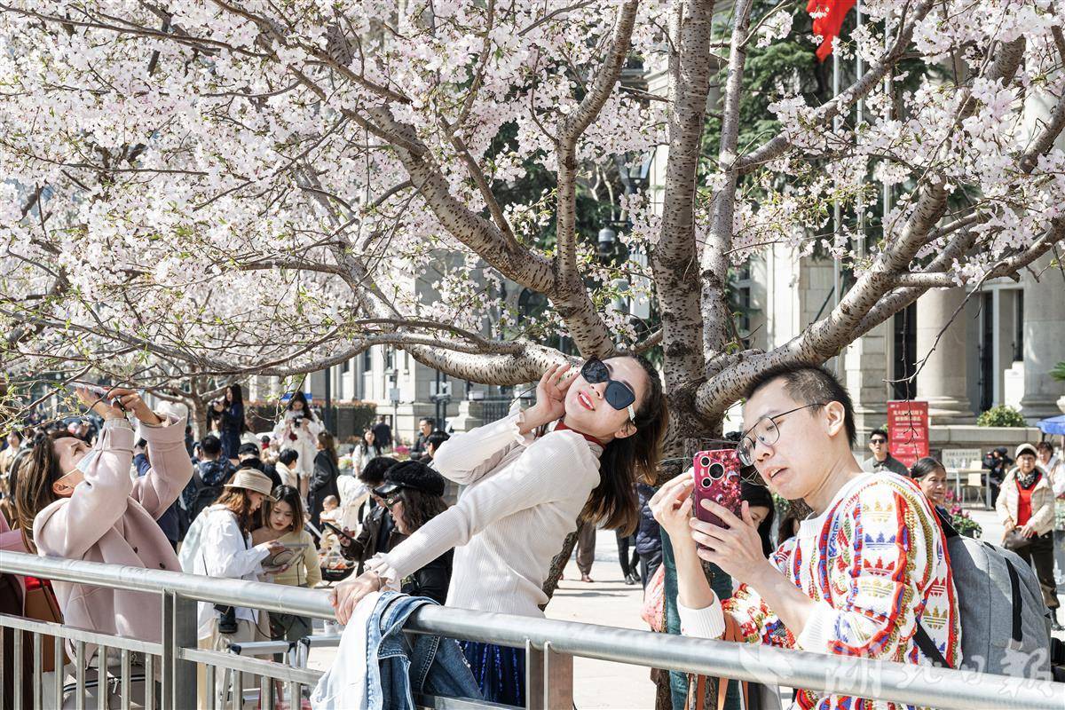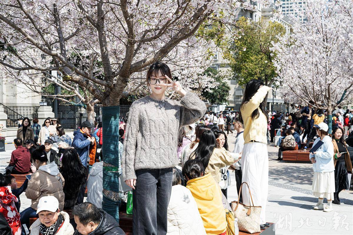 3月18日,武汉春和景明,江汉关广场上12棵樱花树开得繁花似锦,樱花树下人流如织,市民游客争相前来拍照打卡。这片樱花树面对车水马龙的沿江大道,背靠厚重的百年老建筑,展示着武汉春日独有的盛景。 (湖北日报全媒记者 任勇 摄)