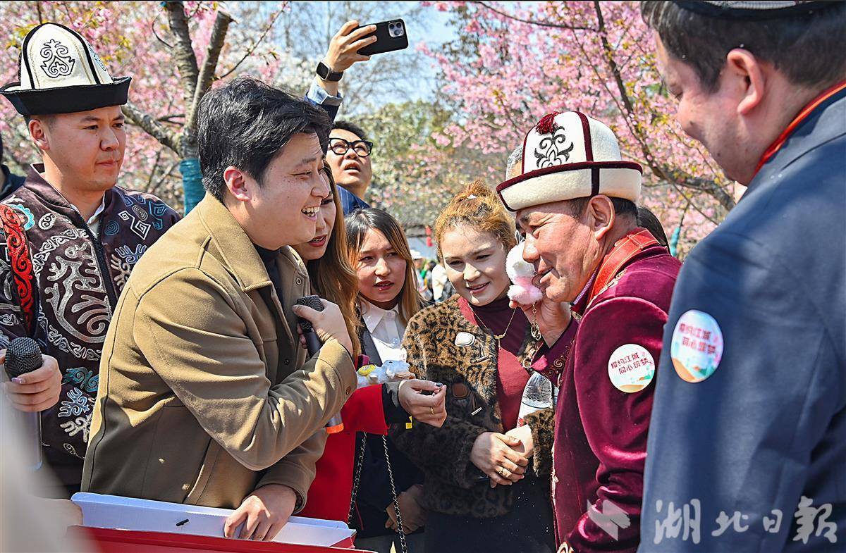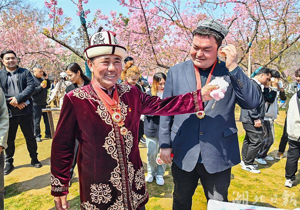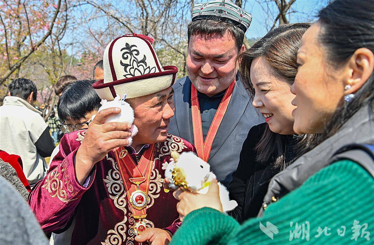 3月19日,武汉市东湖樱园里,美丽的樱花树下,来自新疆的“党徽大叔”阿布都加帕尔·猛德正用心地学起了“得了”“莫急”武汉话。阿布都加帕尔·猛德是新疆克孜勒苏柯尔克孜自治州木吉乡的一位基层牧民党员。2021年,他帮助几名武汉游客脱困。游客想给他报酬表示感谢,他迅速亮出胸前的党徽说:“钱,不要,看这个!”他的暖心之举感动亿万网民,被亲切地称为“党徽大叔”。(湖北日报全媒记者 朱熙勇 摄)