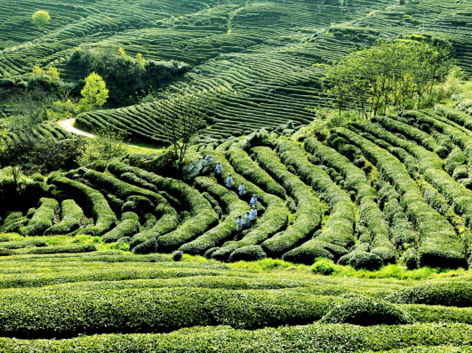 玉皇剑茶庄位于湖北省谷城县五山镇下七坪村,既是非物质文化遗产玉皇剑茶制作技艺传承示范基地庄园,又是国家3A级景区。所在的地区是茶叶生长的黄金地带,茶园冬季休眠期长,茶叶营养物质积累多。玉皇剑茶的制作技艺历史悠久,最早可追溯到明末清初。其制作工艺经过数百年的传承与发展,已形成了独特且完善的制茶流程。玉皇剑茶的制作过程严谨而精细,包括采摘、摊放、杀青、做形、干燥和精选六道程序。每一步都讲究细节,要求严格,以确保茶叶的品质和口感。