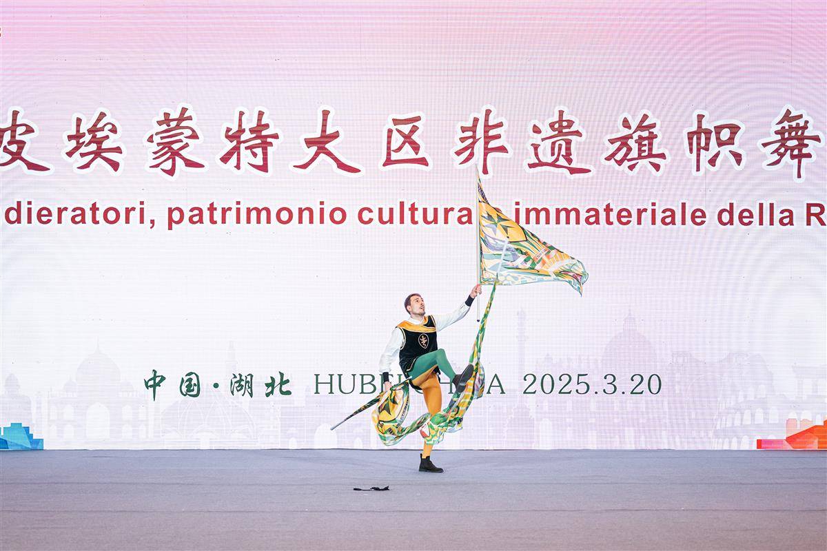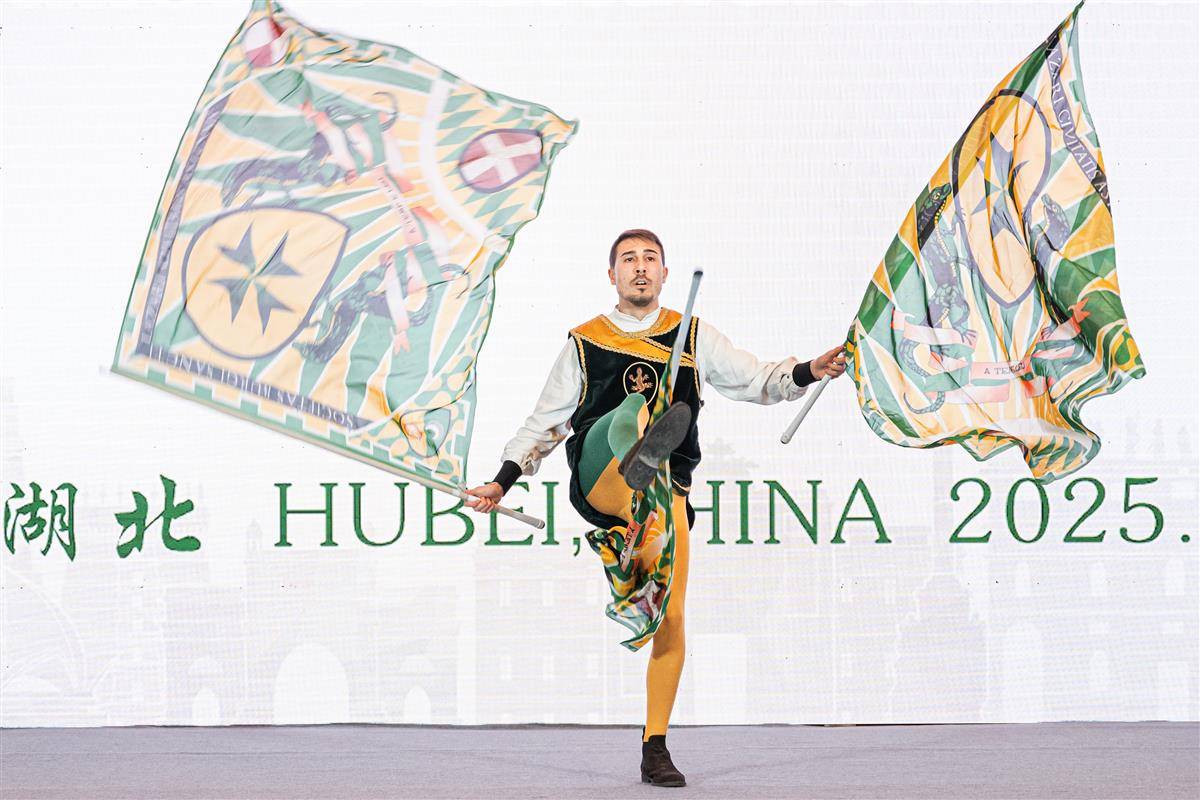 活动开场前,意大利皮埃蒙特大区非遗旗帜舞表演。(湖北日报全媒记者 任勇 摄)