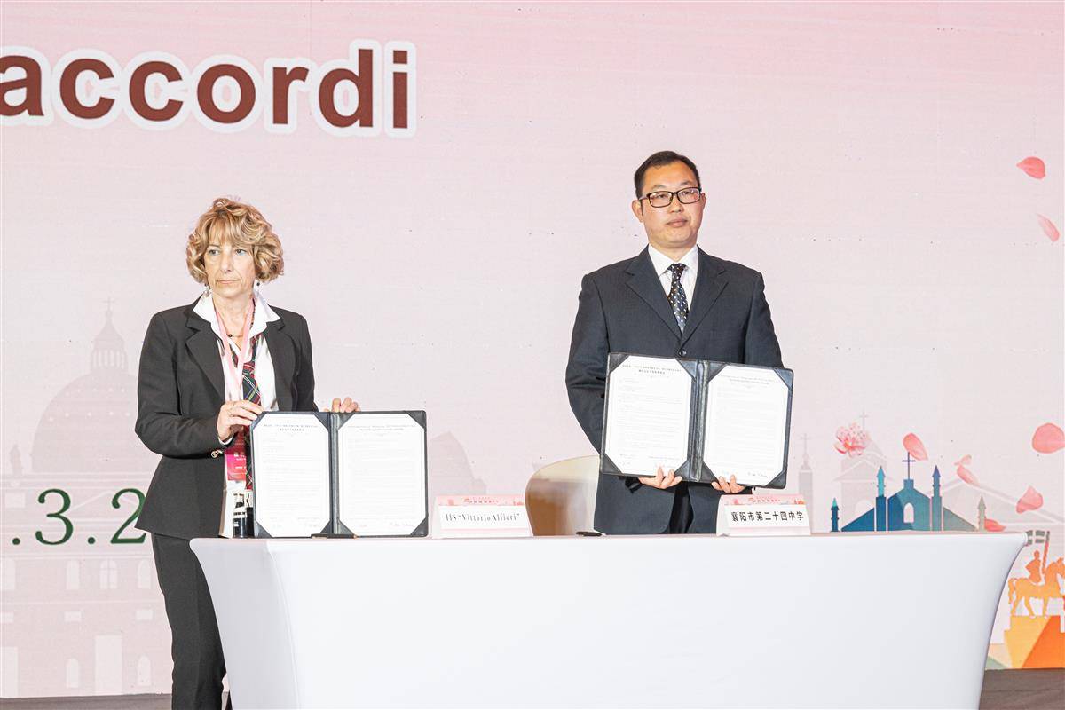 襄阳二十四中与意方阿斯蒂维托里奥·阿尔菲耶里综合高中签署合作文件。(湖北日报全媒记者 任勇 摄)