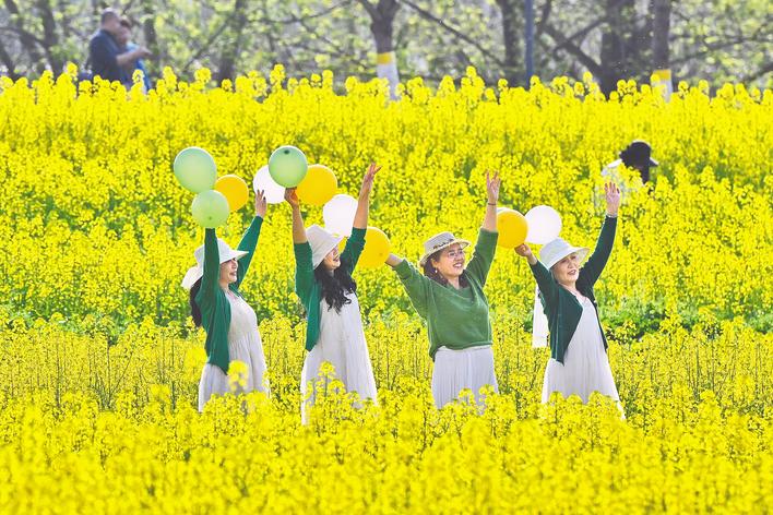 3月20日,春分之际,宜昌市卷桥河湿地公园内油菜花正值盛放期,金黄的花海与春日暖阳相映成趣,吸引众多游客前来踏青赏花。 (湖北日报全媒记者 刘曙松 摄)