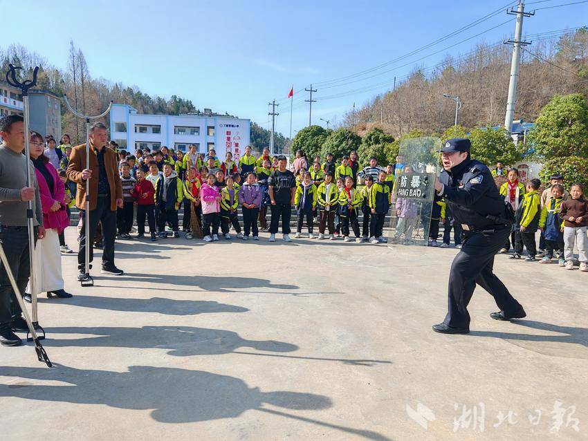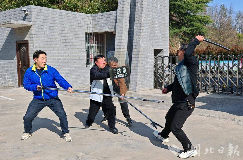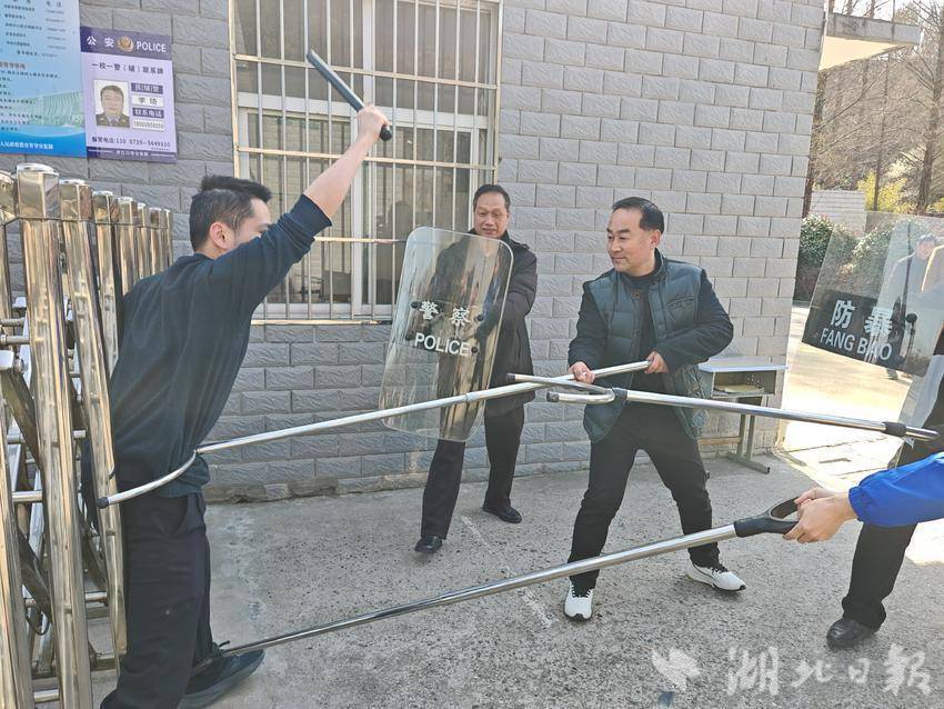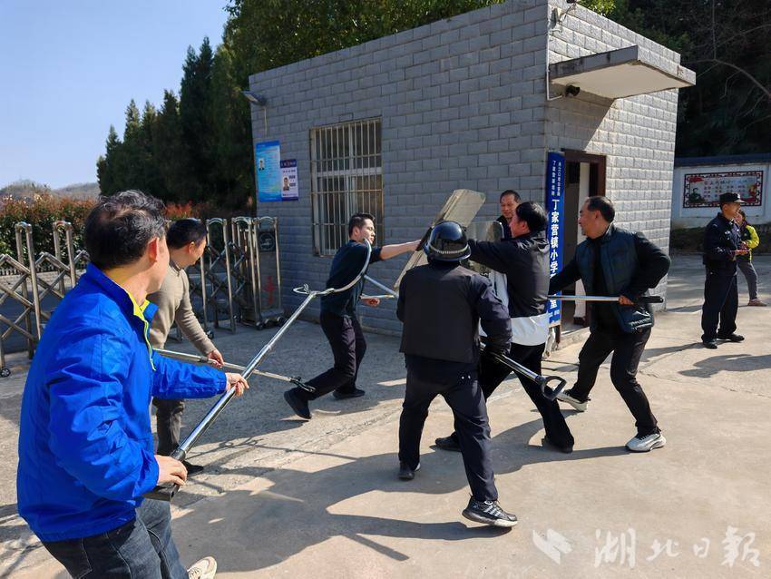 湖北日报客户端讯(通讯员 张继敏 陈朋)3月19日下午,丹江口市丁家营镇小学校园内骤然响起刺耳的警报声,一名“手持凶器的歹徒”试图强行闯入校门,被学校安全应急小队成功“制服”,防暴演练的一幕发生在校园门口。
