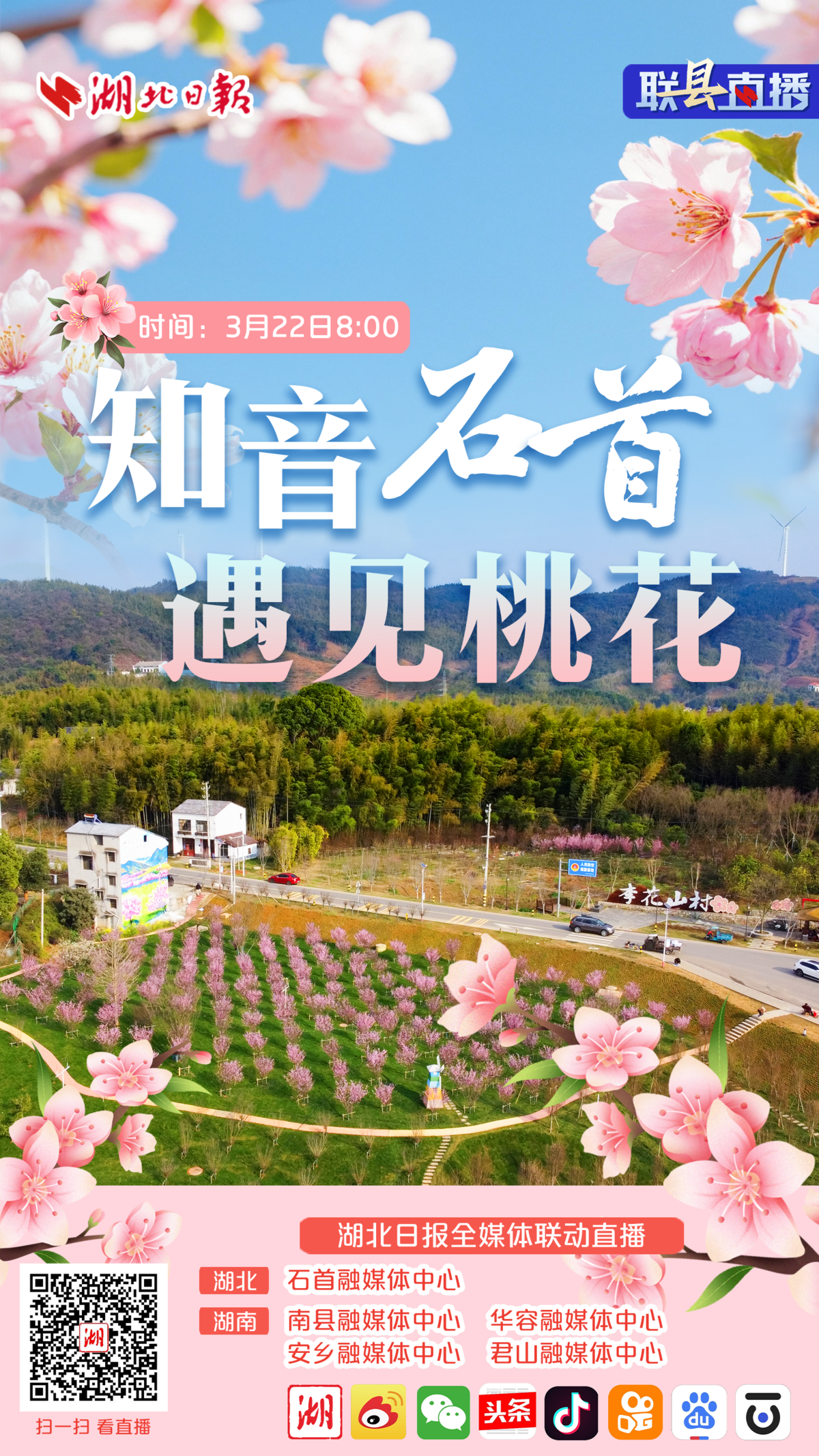 3月22日,2025石首桃花山旅游季正式启动。上午8:20,湖北日报将以“1+5”区域融合直播模式,联动湖北石首融媒体中心,湖南南县、华容、安乡、君山融媒体中心,共6家媒体单位,相约湖北石首桃源小镇,执镜头为笔,绘桃源画卷。