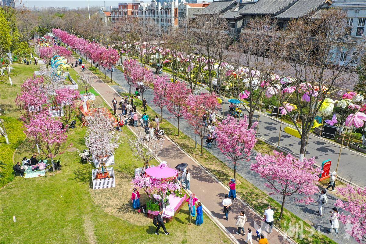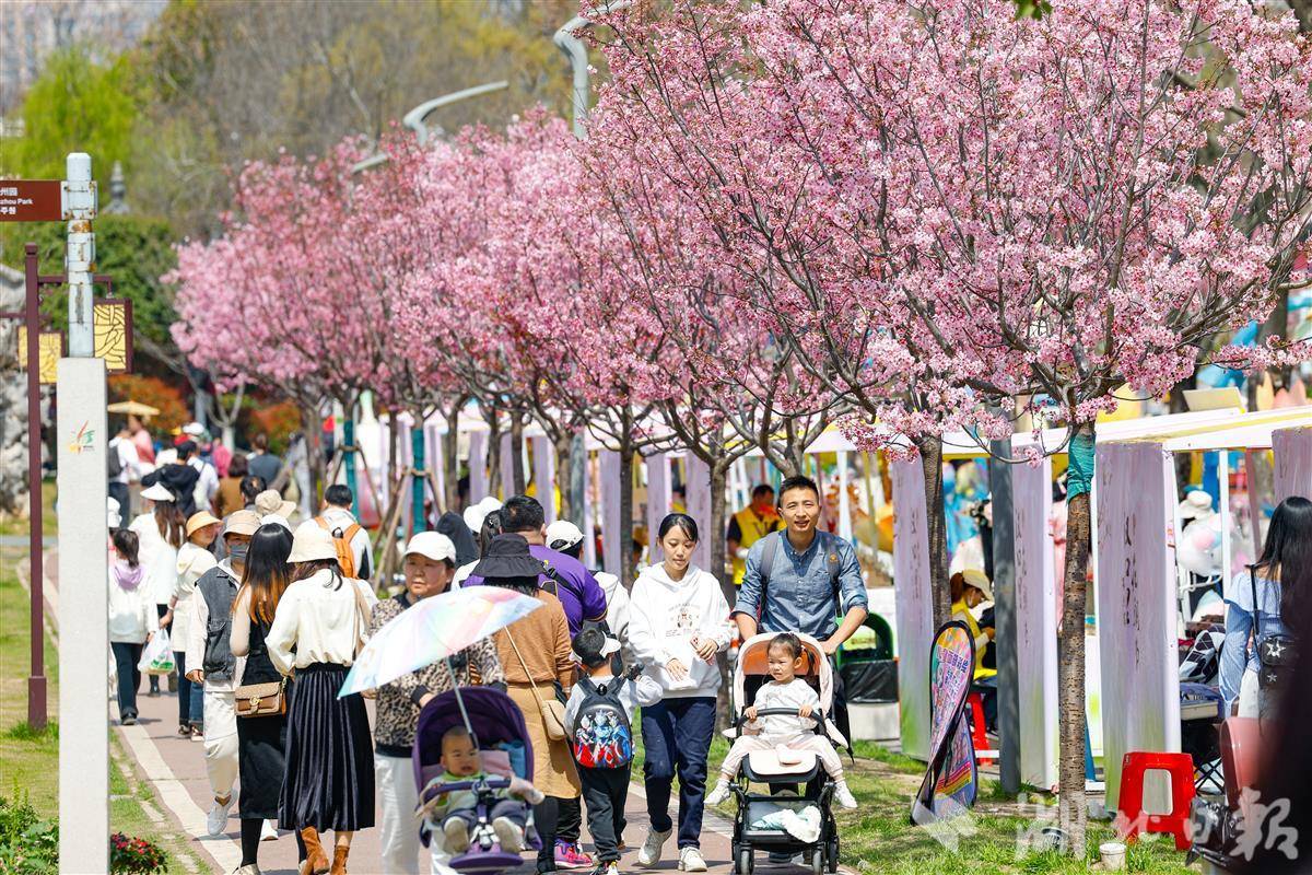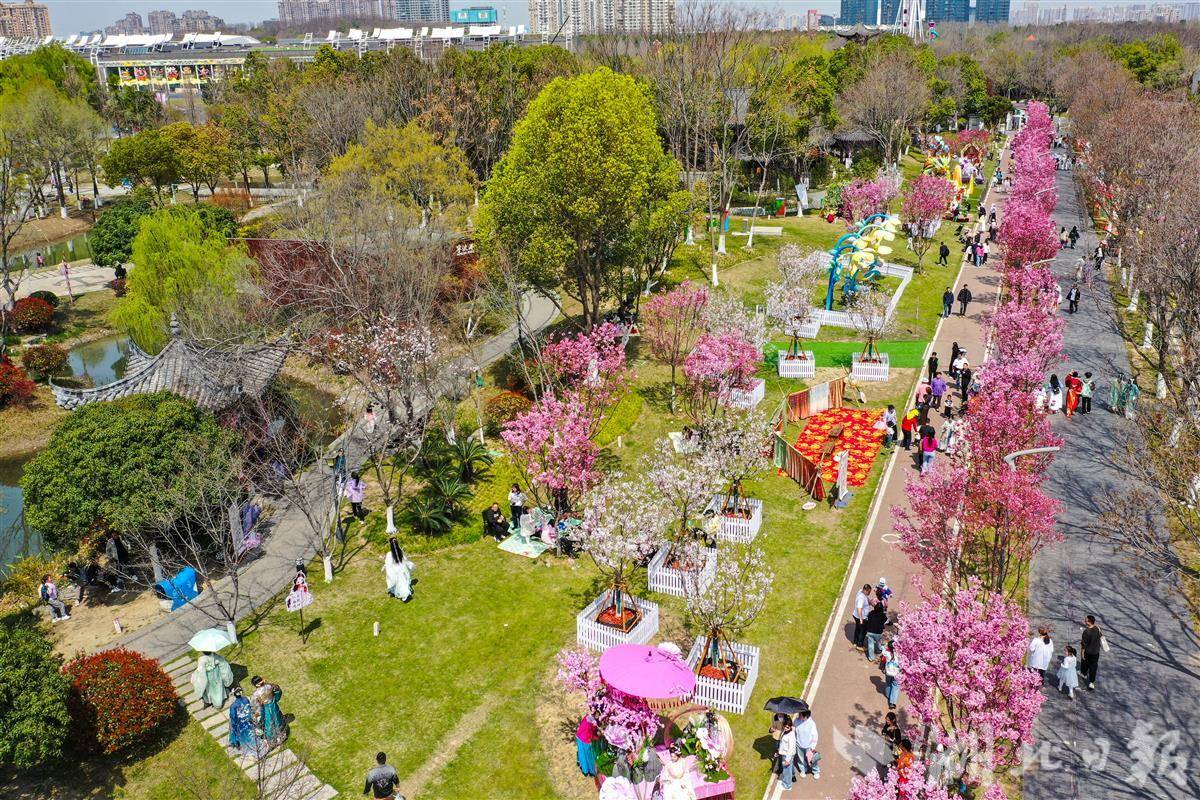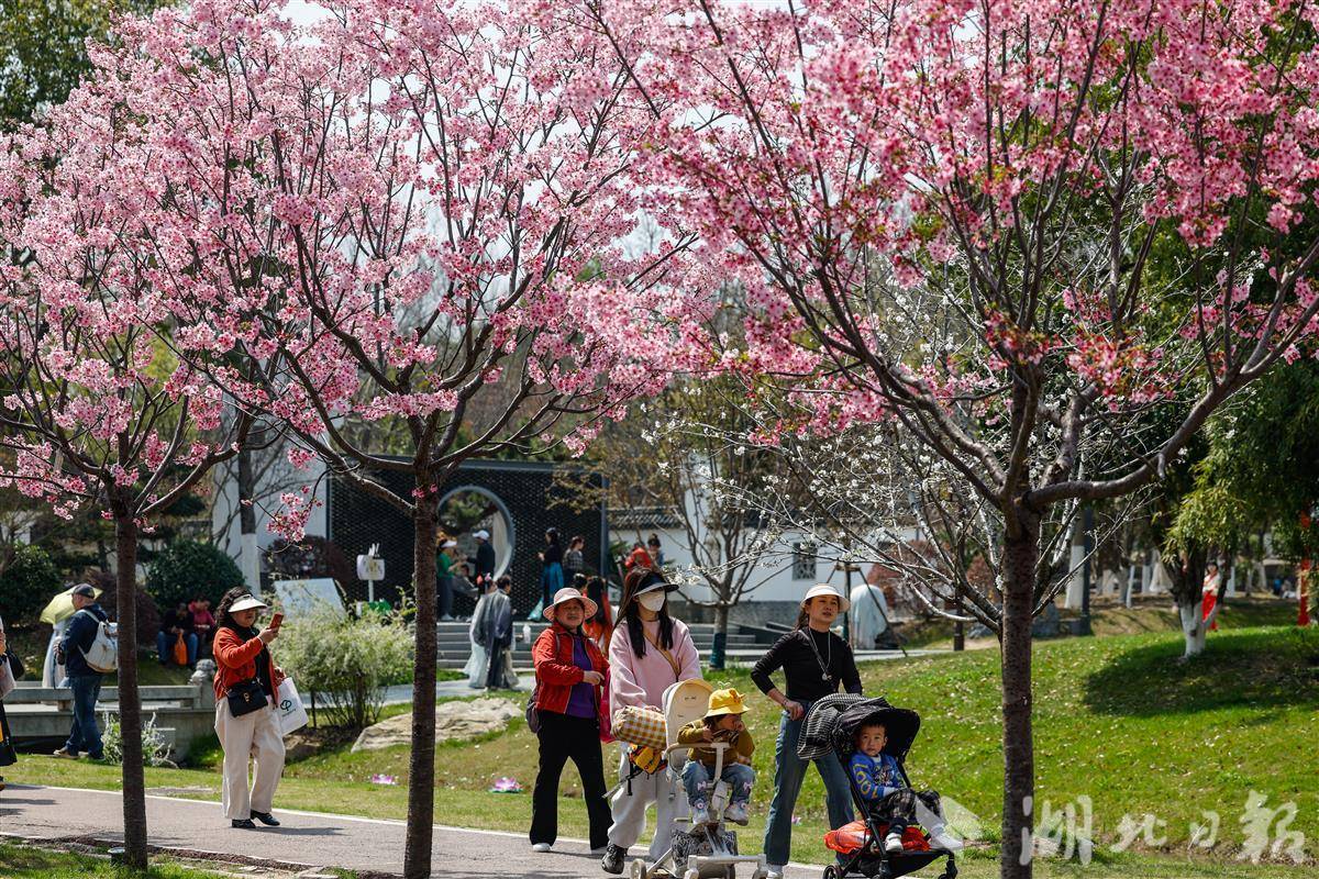 3月22日,武汉迎来温暖的周末,在武汉园博园,从东门到长江文明馆沿线花开成一条粉色的赏花带,春光无限。大批游客走进园区游玩赏花,共享春光。(湖北日报全媒记者 倪娜 通讯员 徐志刚 摄)