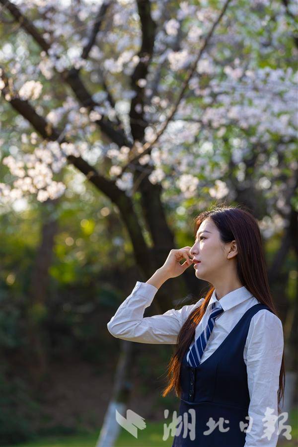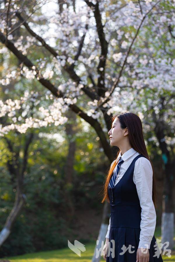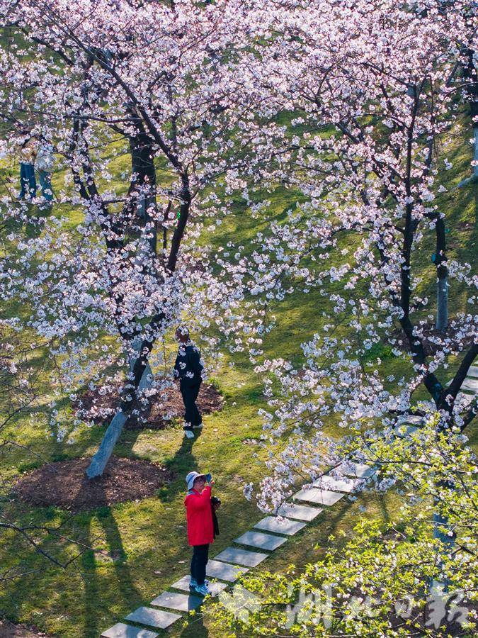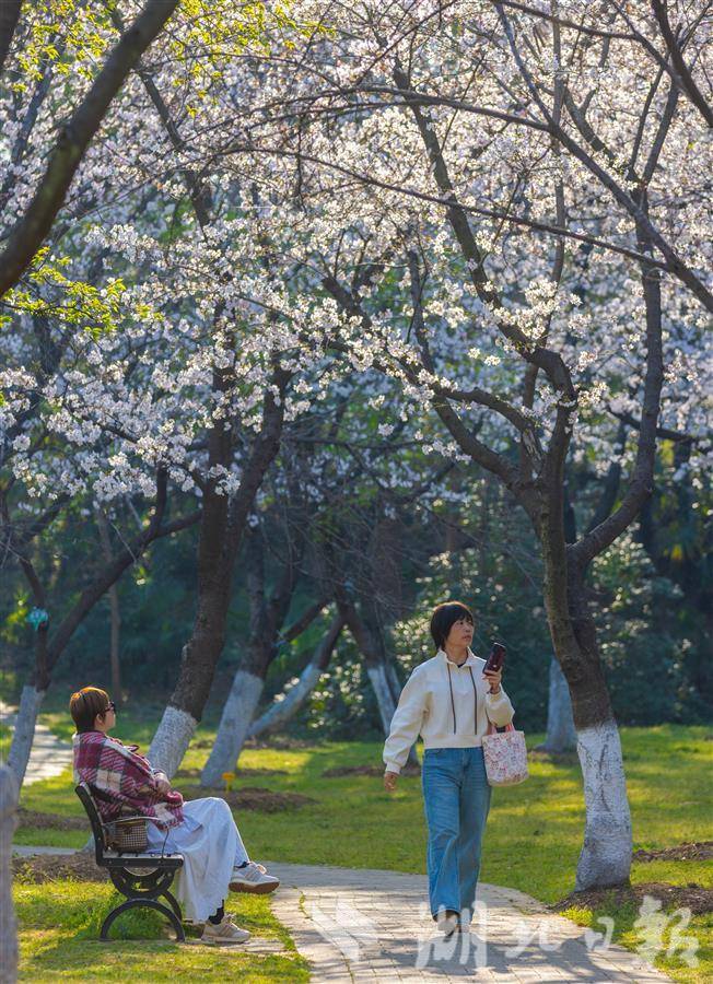 3月22日,武汉青山公园,游客在盛开的樱花下游玩。(湖北日报全媒记者 柯皓 摄)
