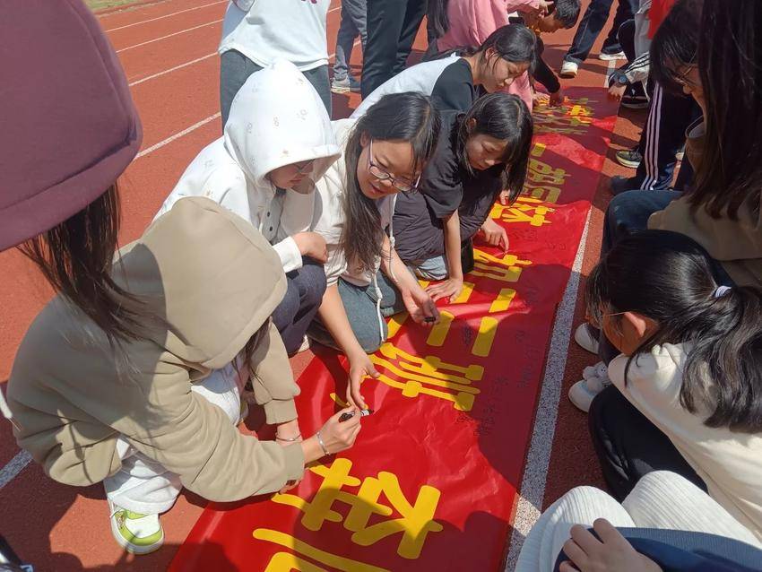 宣誓完毕,学生们在老师的引导下,纷纷在班级横幅上签下自己的名字。