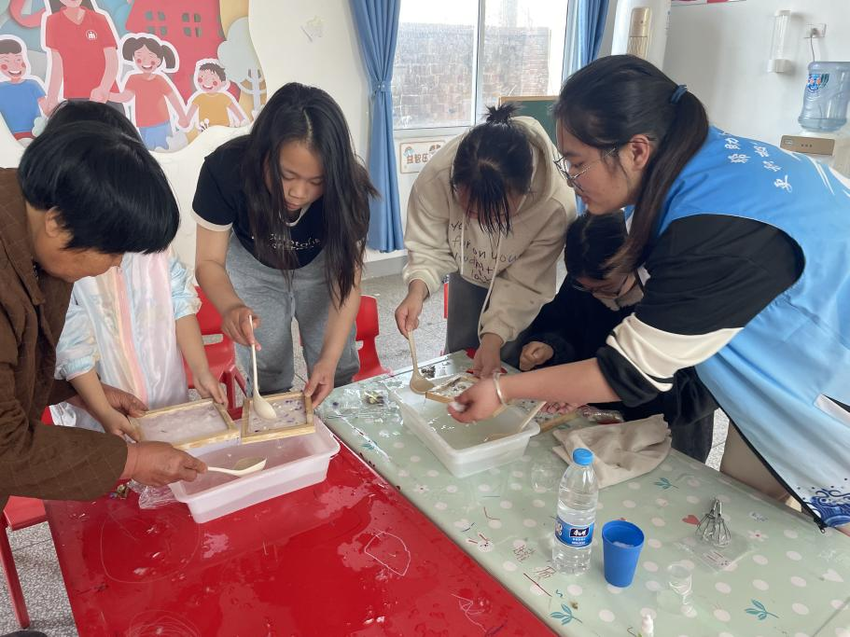 在岳口镇邓巷村开展了“古法造纸初体验,趣味传承匠心 ”主题活动。工作人员详细介绍了古法造纸的历史渊源、工艺流程以及其在文化传承中的重要意义。为了加深孩子们对造纸如何产生的印象,社工带领孩子们进行造纸术手工制作体验。在社工的指导下,他们小心翼翼地搅拌纸浆、铺展纸膜、晾晒纸张,每一个步骤都充满了探索的乐趣。