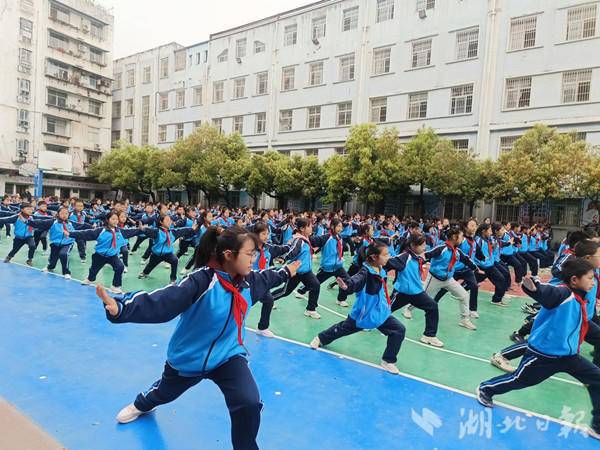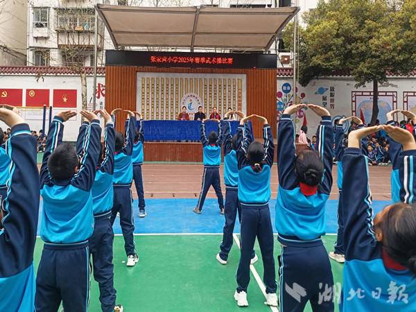 湖北日报客户端讯(通讯员 刘玉萍 赵志庆)为积极响应“每日2小时体育运动”号召,进一步弘扬中华武术文化,彰显学校武术特色教育成果,3月27日,丹江口市张家营小学成功举办了一场精彩纷呈的武术操比赛。当激昂的武术操音乐在校园上空响起,校园瞬间被点燃。全校师生以饱满的热情投身其中。