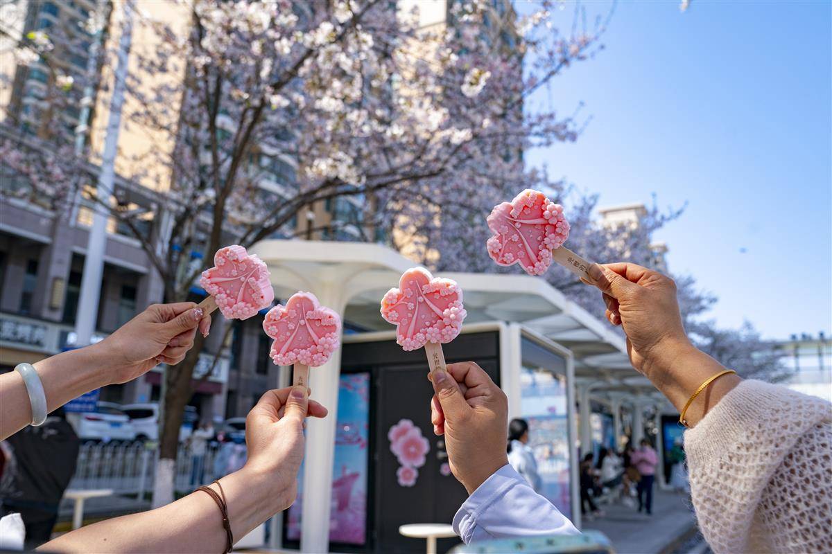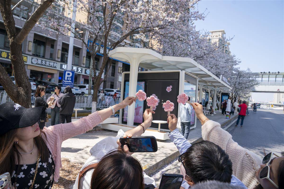 大黄村公交站,几位游客在樱花环抱、焕然一新的白粉色站台上手拿樱花文创雪糕打卡、拍照。
