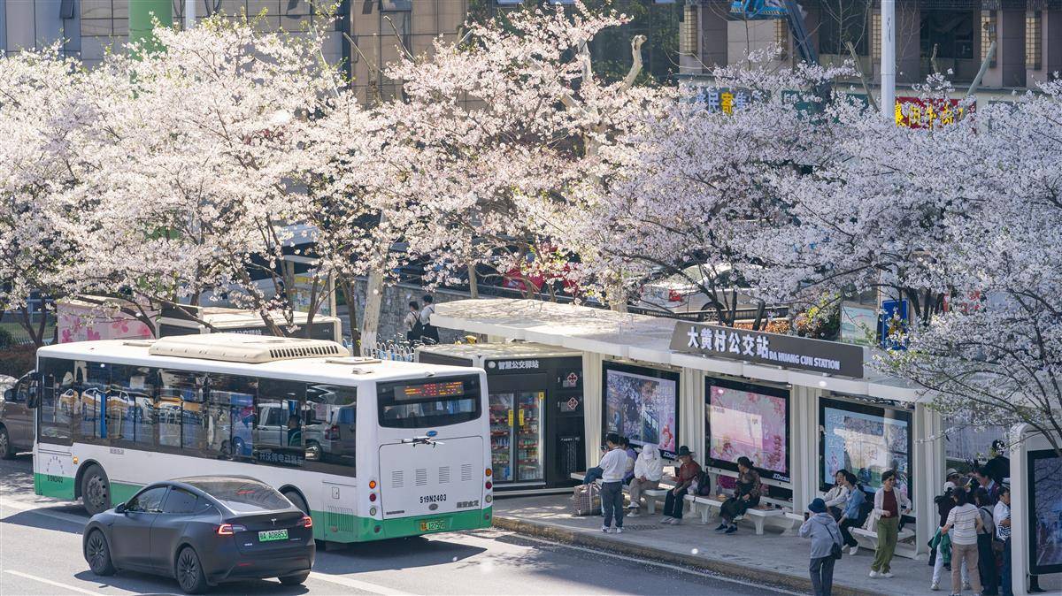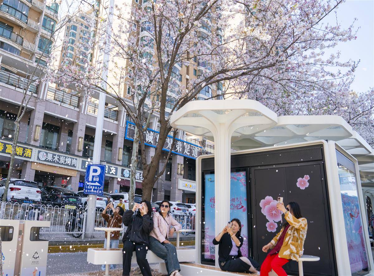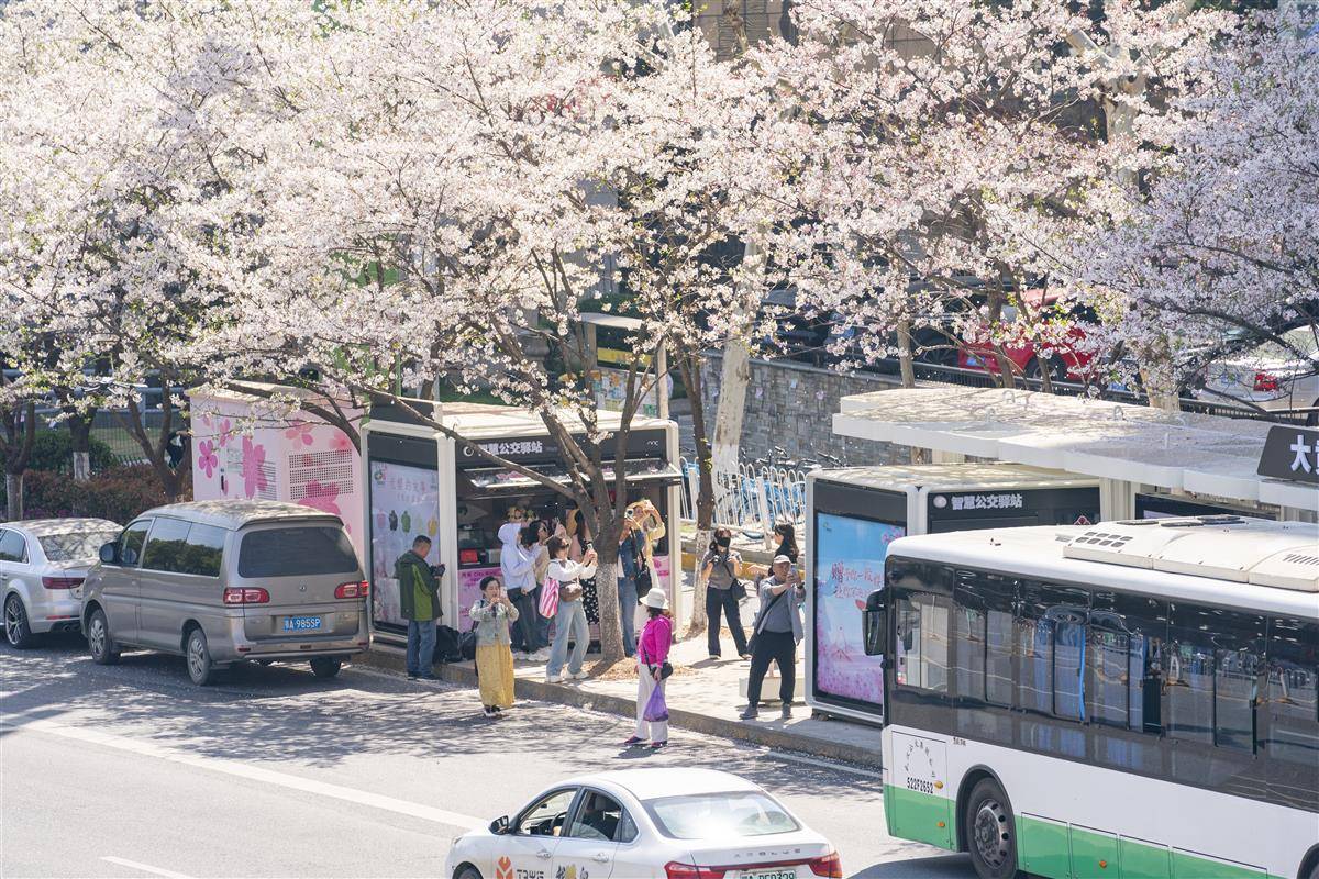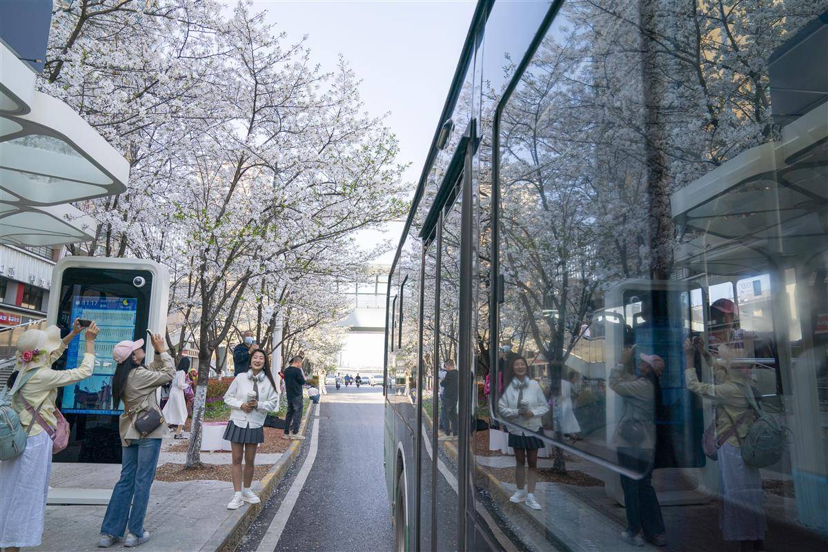 大黄村公交站,市民、游客在樱花环抱、焕然一新的白粉色站台上赏花、打卡、拍照。