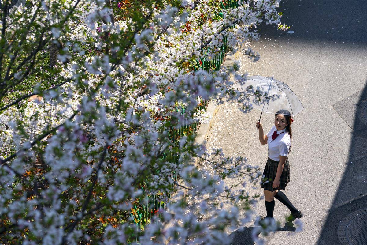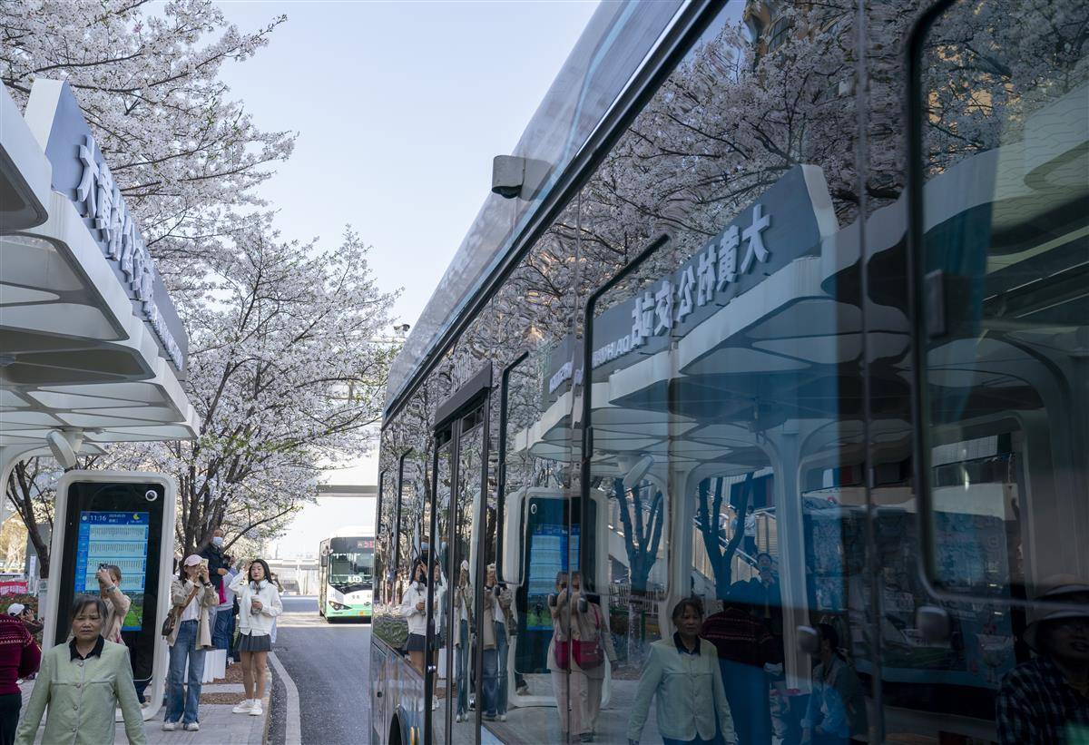 3月25日,武汉市洪山区珞瑜东路大黄村公交站,市民、游客在樱花环抱、焕然一新的白粉色站台上赏花、打卡、拍照。据介绍,大黄村公交车站旁的樱花最早种植于2015年,相关部门在虹景立交桥沿线的绿化带种植了116棵樱花树,车站因被樱花树环绕,吸引不少人前来拍照,成为了武汉樱花季热门的网红打卡点。由于此前樱花季车站空间狭小,缺乏一些便民服务设施,光谷建设今年全面完成了大黄村公交车站的升级改造工程,提高了服务质量和市民游客的体验。