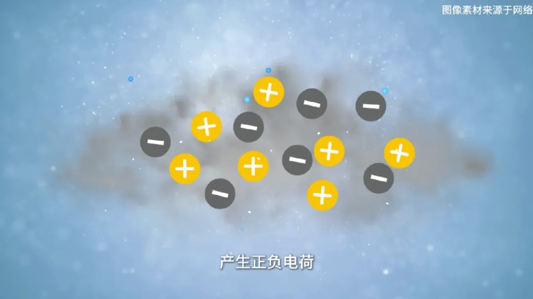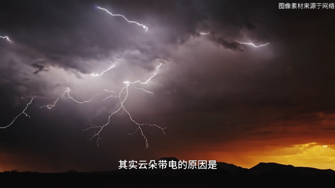 云朵带电的原因是水滴和冰晶在气流中碰撞摩擦,产生正负电荷,然后在气流和重力的作用下分布形成不同极性的电荷区,当这些电荷聚集到一定程度时,就会穿过空气产生放电现象,于是出现了闪电。