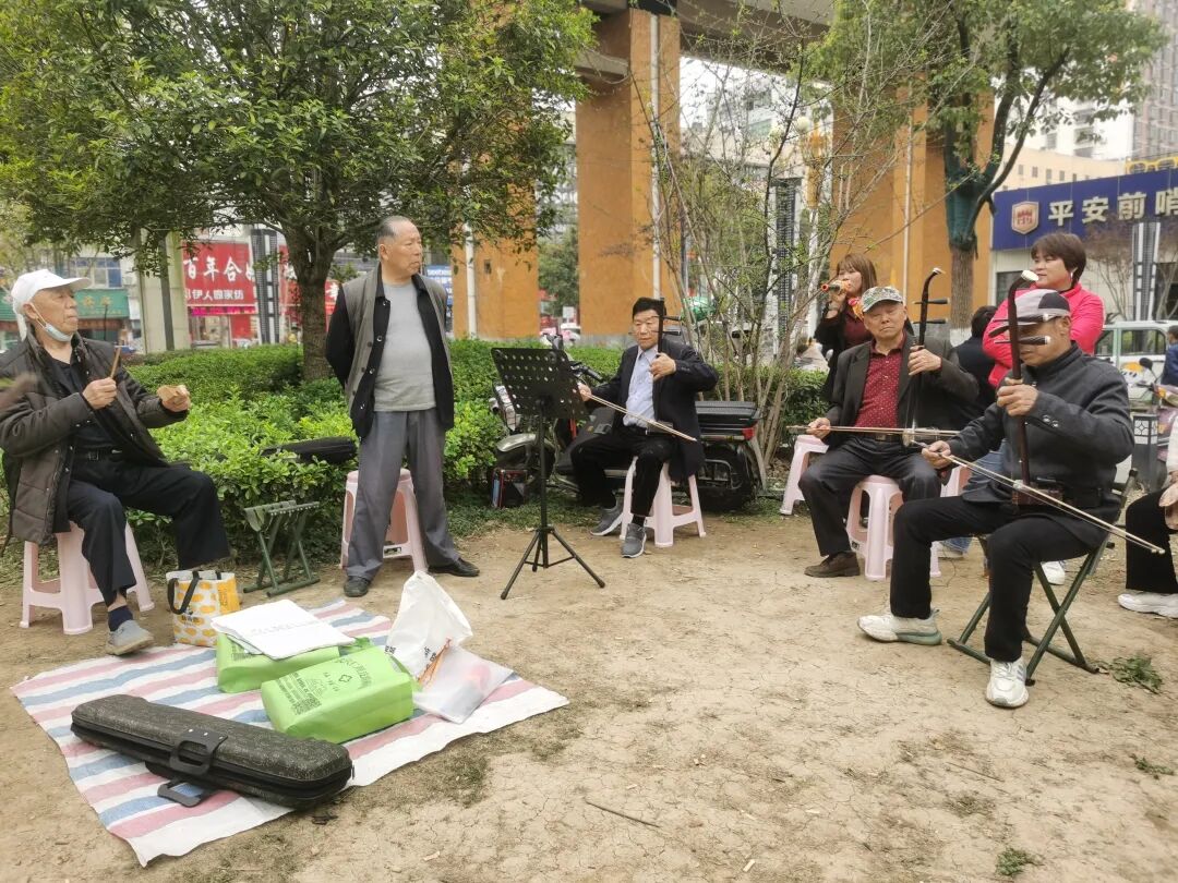 漫步公园,宛如置身于一场永不落幕的音乐盛宴之中。环顾四周,人群熙熙攘攘,热闹非凡。在公园的一角,戏曲小队正激情演绎。这是一支由热爱传统文化的老人们自发组建的队伍,他们各自为战,又默契配合。“你吹打来我弹唱,你唱罢来我登场”,从早到晚,那熟悉的戏曲声不绝于耳。采茶戏《荞麦记》《山伯访友》婉转悠扬,文曲戏《苏三起解》《四郎探母》韵味十足,黄梅戏《天仙配》《十五贯》更是经典传唱,就连京剧《智取威虎山》《红灯记》的精彩片段 也时有呈现。各种戏曲形式在这里争奇斗艳,演员们用精湛的技艺传承和弘扬着地方戏曲文化。